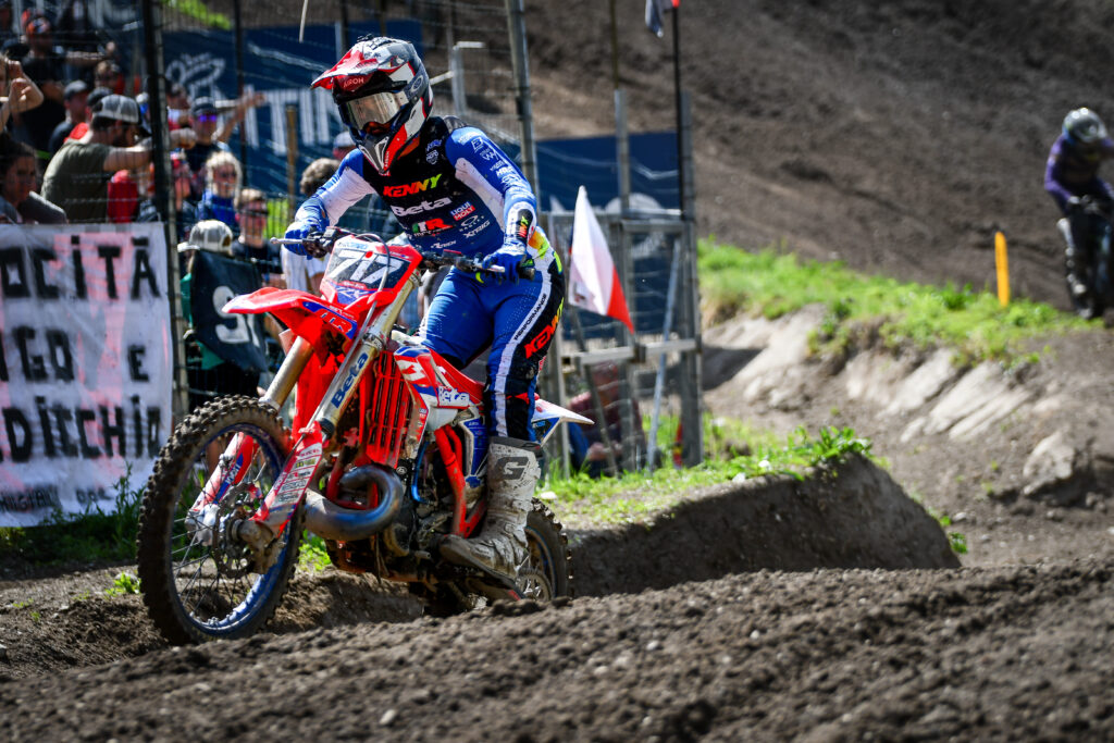 « Honnêtement, Arco, c’est toujours un peu spécial », commente le Français au sujet du tracé de Pietramurata. « Le samedi, c’était vraiment compliqué. On avait cette petite poussière sablonneuse sur du dur, avec des trous très cassants. C’était même dangereux par endroits. Pour des mecs bourrins qui y vont vraiment, ça passe une fois sur deux. Moi, je suis un peu perfectionniste, un peu plus tranquille. Du coup, je prends un peu plus mon temps. Je pense que parfois, ça se retourne contre moi sur des pistes comme ça. C’était un peu mieux le dimanche pour nous. Et pour le deux-temps aussi, parce que c’était un peu sec le samedi. Surtout que je suis parti en pneu sable lors des manches pour optimiser le départ, parce qu’ici, c’est vraiment dur de doubler. Je pense qu’on l’a vu dans toutes les manches. Je préférais galérer un peu sur la piste, mais essayer de bien partir. »