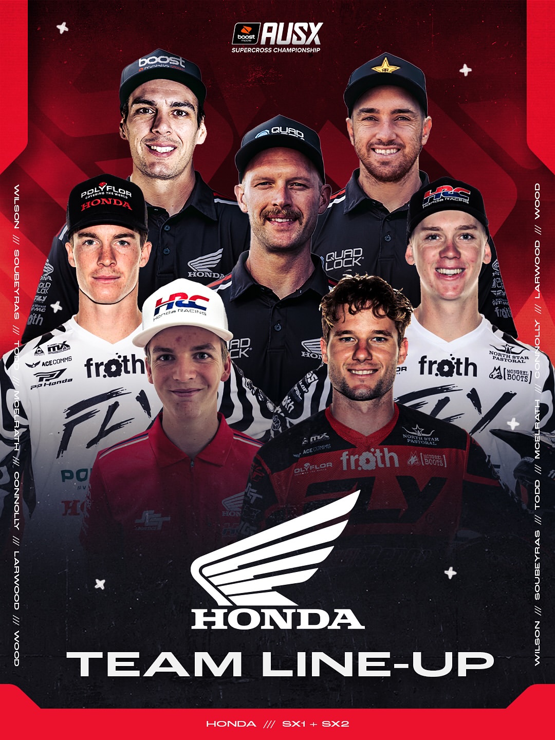 Honda Australie a dévoilé la composition de ses équipes pour le championnat de Supercross Australien, le « Boost Mobile AUSX Supercross ». Neuf pilotes seront répartis sur trois catégories afin de défendre les couleurs de la marque au sein des différents teams engagés. À noter, l’arrivée de Cédric Soubeyras en SX1 – chez Boost Mobile Honda – qui retrouvera donc Dean Wilson (Quadlock Honda) en catégorie reine. Le Britannique tentera de récupérer la couronne perdue l’an passé face à Joey Savatgy.