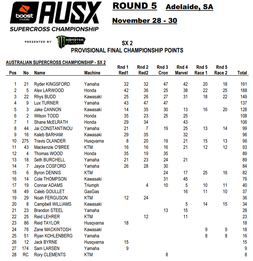 En SX2 et en l’absence de Lux Turner qui avait dominé la saison jusqu’à sa blessure (poignets) à Melbourne, le titre était sur la table; avantage à Ryder Kingsford qui devançait alors Alex Larwood de 12 unités au terme de l’AUSX Open. Larwood (2-1) remportera la dernière épreuve devant Byron Dennis (1-5) et Rhys Budd (4-2), mais la quatrième place de Ryder Kingsford (3-4) sera suffisante pour que le pilote Yamaha décroche le titre cette année, pour seulement 3 petits points d’avance.