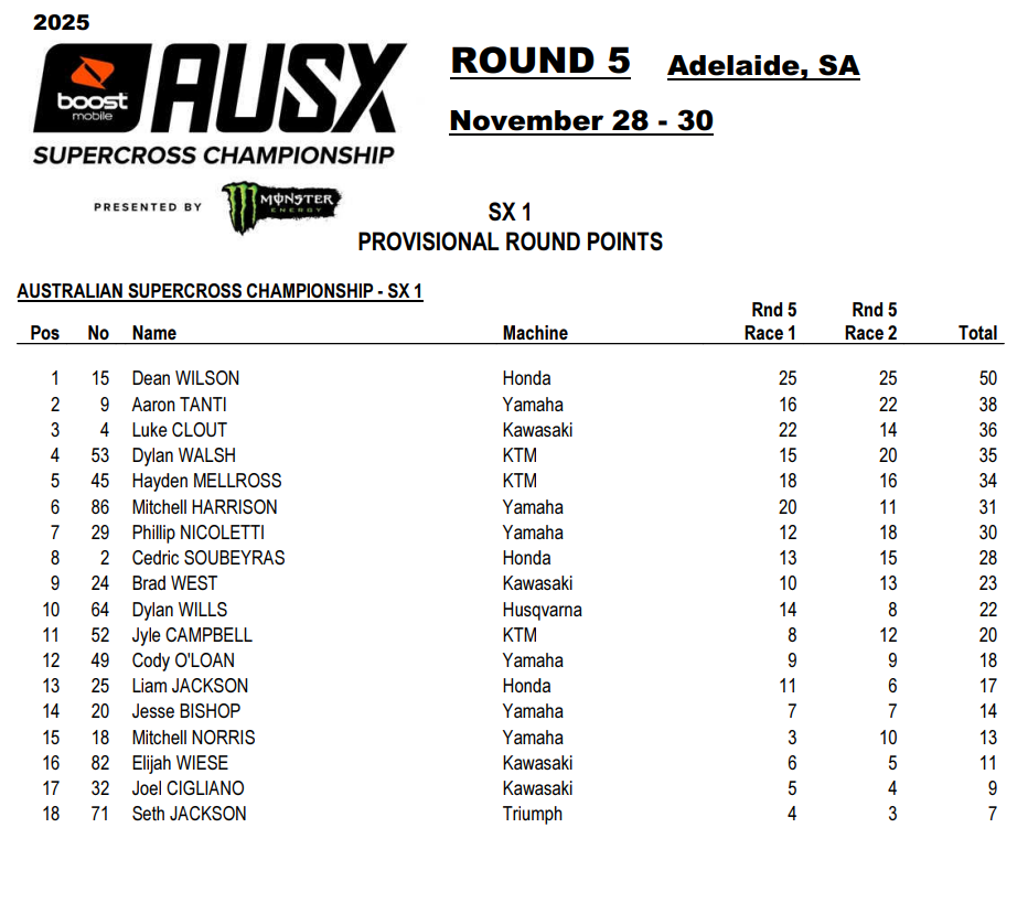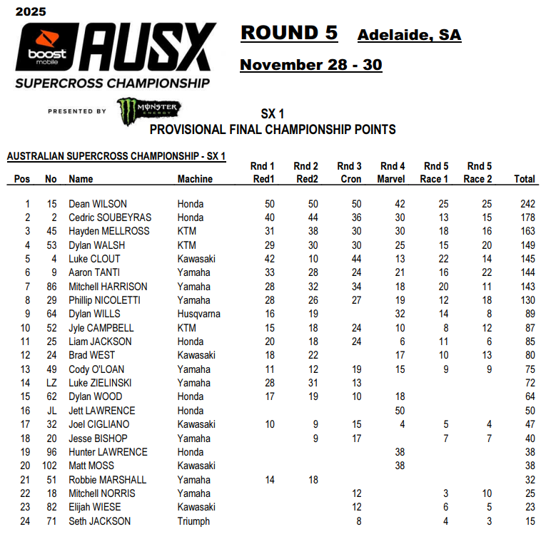 Au championnat, Dean Wilson l’emporte avec 64 points d’avance sur Cédric Soubeyras. Touché à l’entraînement quelques jours avant la finale d’Adélaïde, le pilote Français a serré les dents pour participer à l’épreuve malgré 4 côtes cassées. Il termine 8ème du dernier round en signant un 8-6, lui permettant de conserver sa place de vice-champion SX1 cette année pour 15 points d’avance sur Hayden Mellross. Le kiwi Dylan Walsh termine au pied du podium final avec 149 points au compteur, 4 devant Luke Clout et 5 devant Aaron Tanti. Mitchell Harrison, lui, perd 2 places lors de cette finale, au profit des deux garçons précédemment cités. Premier pilote Américain du championnat, Harrison termine 7ème du général final devant son compatriote Phil Nicoletti (8e).