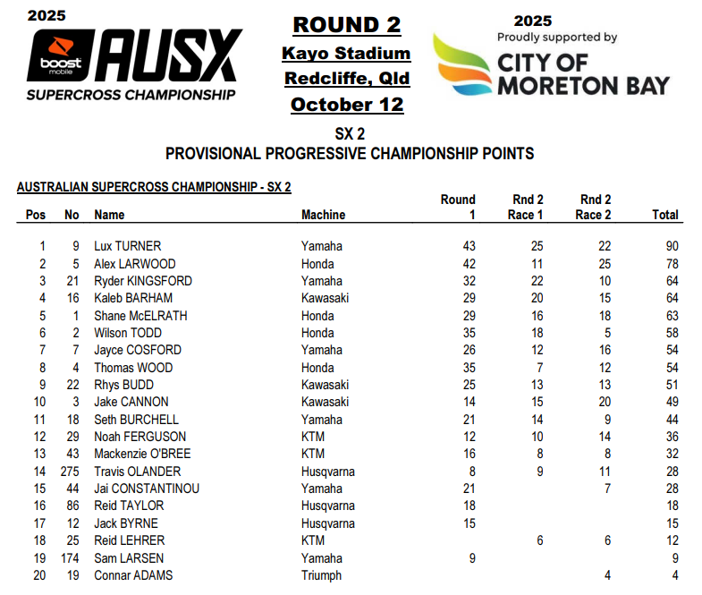 En SX2, Lux Turner (1-2) s’offre une deuxième victoire d’épreuve consécutive. L’Australien cède toutefois la victoire dans la seconde manche à Alex Larwood (10-1), piégé au départ de la première après une chute collective impliquant ses coéquipiers Shane McElrath et Tiger Wood.