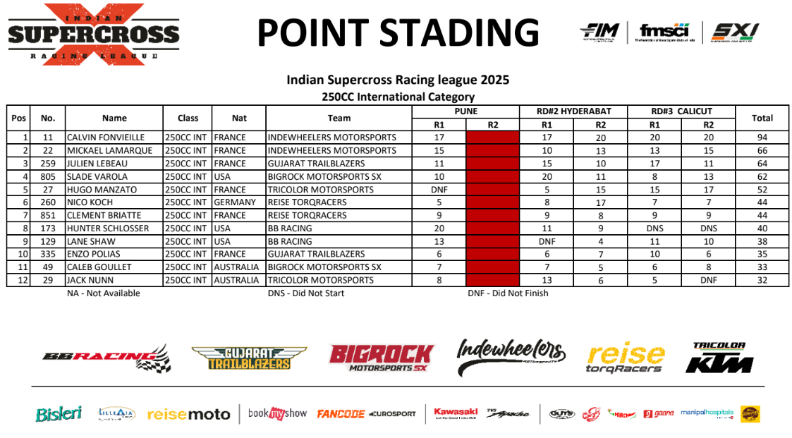 Au championnat — après trois rounds et cinq finales — Calvin Fonvieille s’impose avec 28 points d’avance sur Mickaël Lamarque et 30 points sur Julien Lebeau. L’Américain Slade Varola prend la quatrième place finale devant Hugo Manzato et l’Allemand Nico Koch (6e). Clément Briatte termine 7e du championnat devant Hunter Schlosser (8e). Vainqueur de la première épreuve du championnat, le pilote BB Racing avait perdu de gros points à Hyderabad et n’a pas participé à la finale.