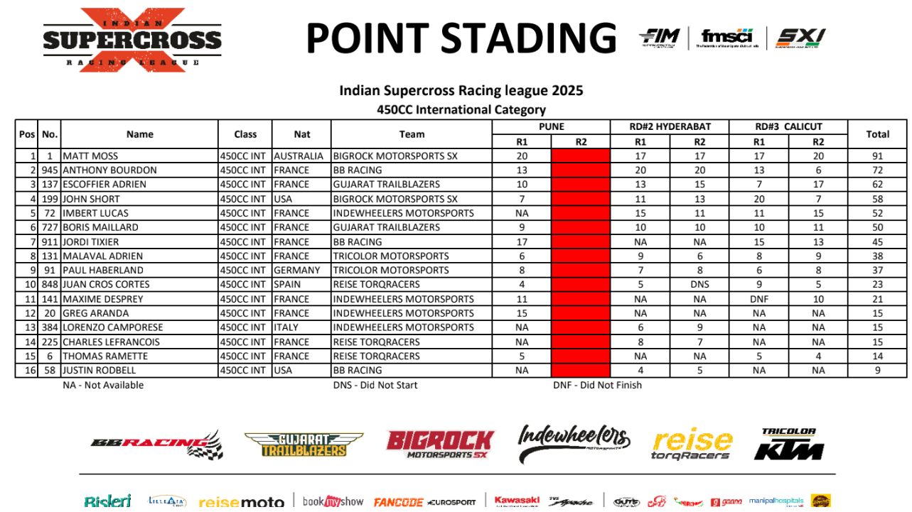 Champion SX1 sur le SX Tour cette année, Maxime Desprey a connu des soirées mouvementées en Inde. Cinquième lors de l’ouverture du championnat à Pune, puis absent — toujours pour cause de WSX — à Hyderabad, le pilote français, soutenu par IndeWheelers Motorsports, a chuté dès le premier tour de la première manche à Calicut et a été contraint à l’abandon. Sixième de la seconde manche, il se contente finalement de la 11e place du championnat cette année, devant Grégory Aranda, qui n’aura participé qu’à l’ouverture du championnat.