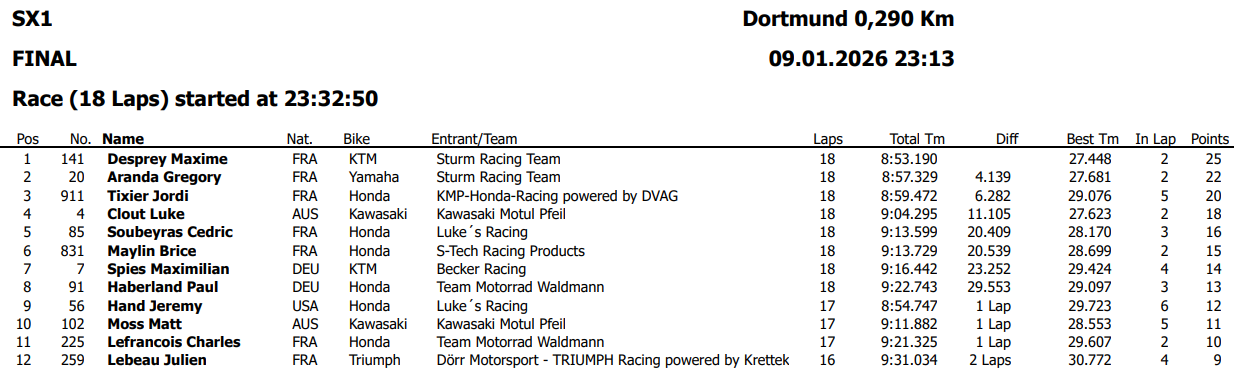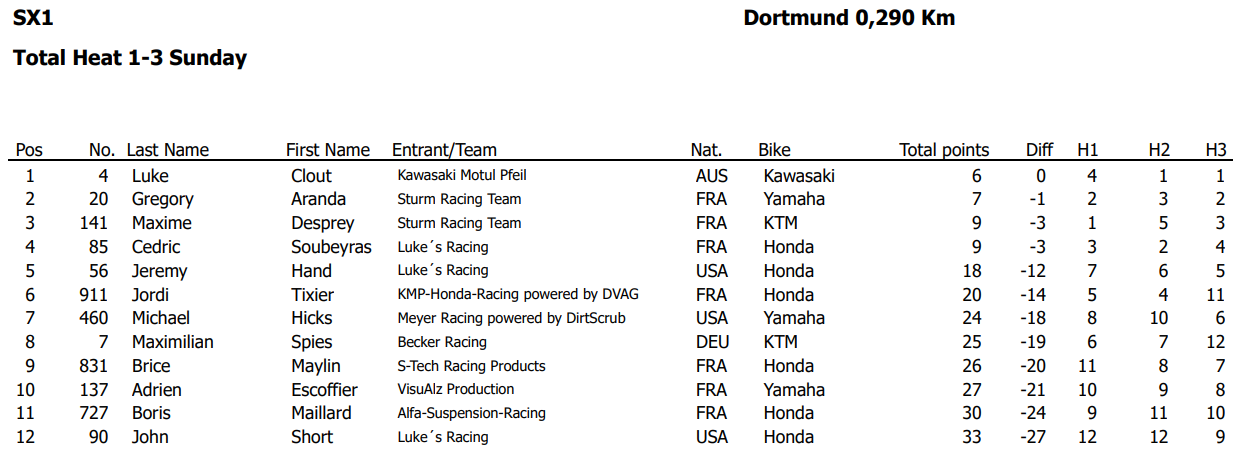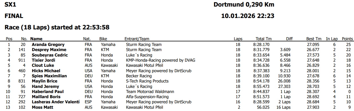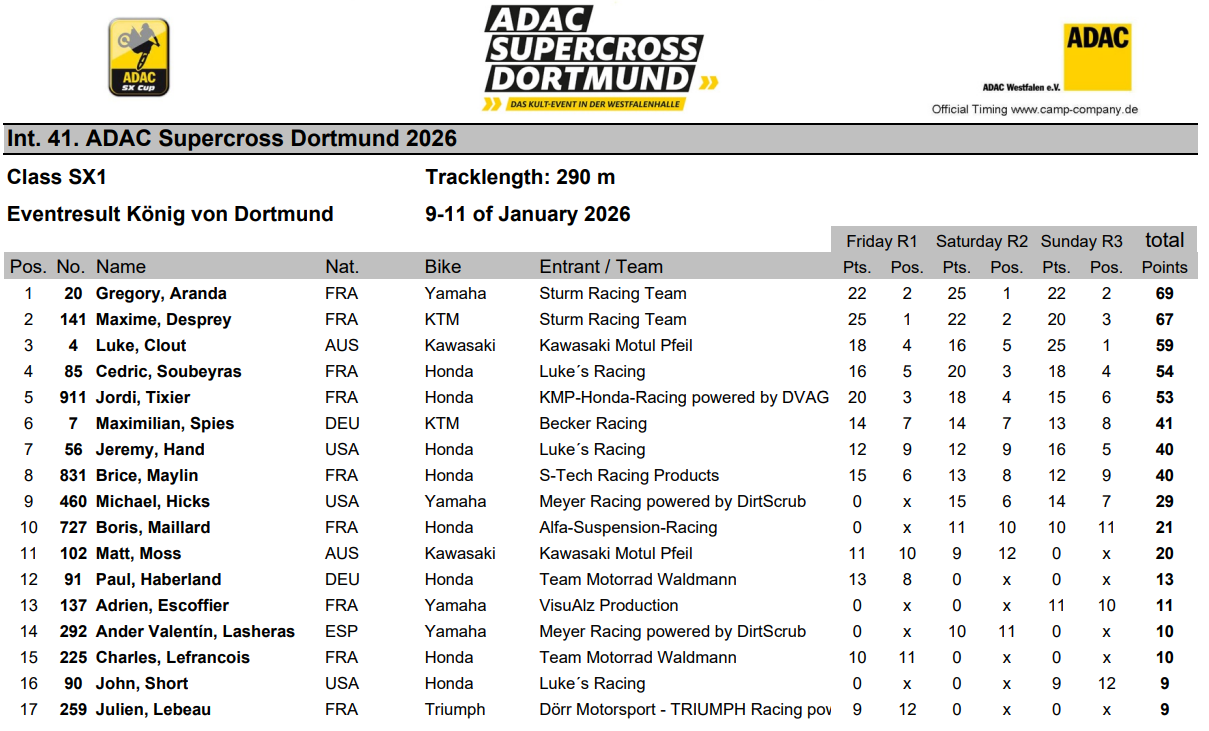 Si le titre de champion ADAC revient à Cédric Soubeyras et que Luke Clout signe la victoire du dimanche, c’est Grégory Aranda qui décroche, lui, un nouveau titre de King of Dortmund au terme du week-end et au cumul des trois soirs. Grégory s’impose de justesse devant son coéquipier Maxime Desprey, battu de seulement deux points, tandis que Luke Clout, Cédric Soubeyras et Jordi Tixier complètent le top 5 de cette 41ème édition.