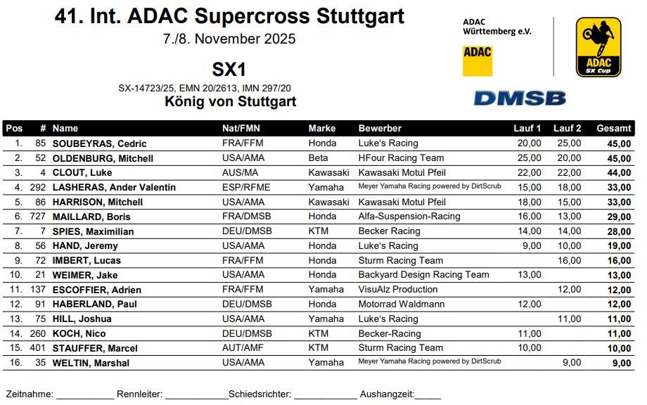 Cédric Soubeyras (3-1) et Mitchell Oldenburg (1-3) terminent ex-aequo au terme du week-end, avantage au pilote Français pour sa victoire lors de la seconde soirée. L’Australien Luke Clout (2-2) complète le podium du Supercross de Stuttgart devant Ander Valentin (6-4) et Mitchell Harrison (4-6). Boris Maillard (5-8) prend la sixième place en SX1 devant Maximilian Spies (7-7) et Jeremy Hand (12-11). Lucas Imbert (DNQ-5) a affiché une belle vitesse le samedi, mais a loupé la qualification le vendredi: il se contentera de la 9ème place devant Jake Weimer (8-DNQ).