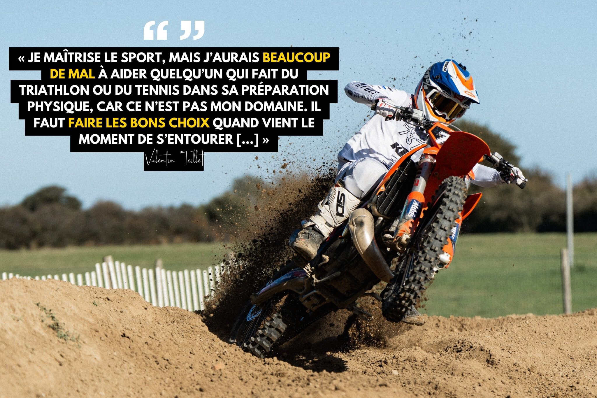 Aujourd’hui, je suis spécialisé dans le Motocross et je propose du coaching en Motocross. Il est important de comprendre qu’il est très compliqué pour un préparateur physique de s’adapter à un sport qu’il ne connaît pas. Je maîtrise le sport, mais j’aurais beaucoup de mal à aider quelqu’un qui fait du triathlon ou du tennis dans sa préparation physique, car ce n’est pas mon domaine. Il faut faire les bons choix quand vient le moment de s’entourer.
