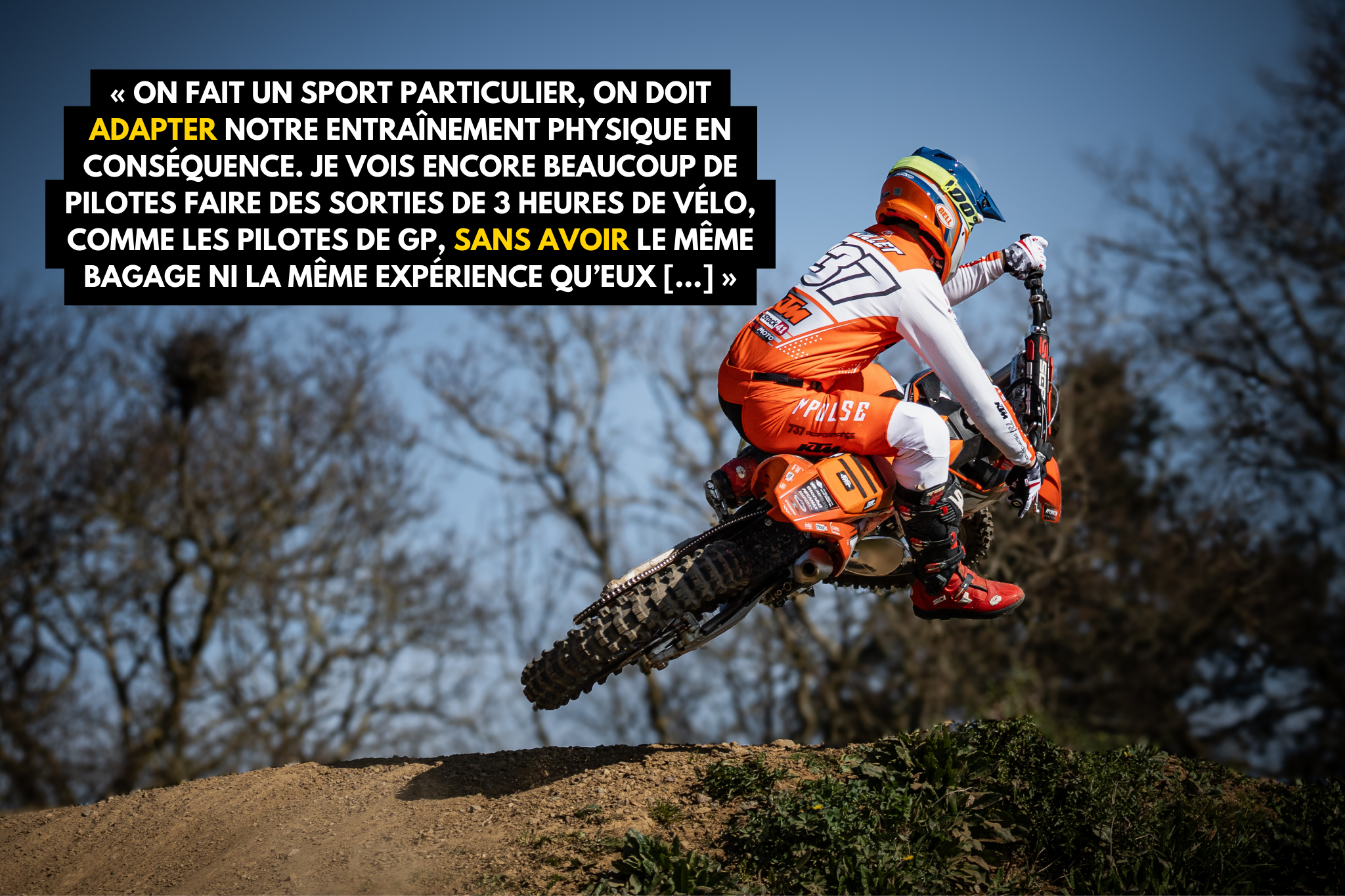 Musculairement, le motocross  travaille des muscles particuliers qu’on ne peut pas facilement isoler en dehors du travail sur la moto. Le point le plus important pour le physique, c’est de comprendre qu’il est important de le travailler sur la moto en premier lieu: on fait des manches, on roule. Ensuite, le sport à côté de la moto, c’est pour perfectionner sa préparation physique, et s’endurcir mentalement. Apprendre à se faire du mal, à ne pas lâcher quand ça devient difficile.