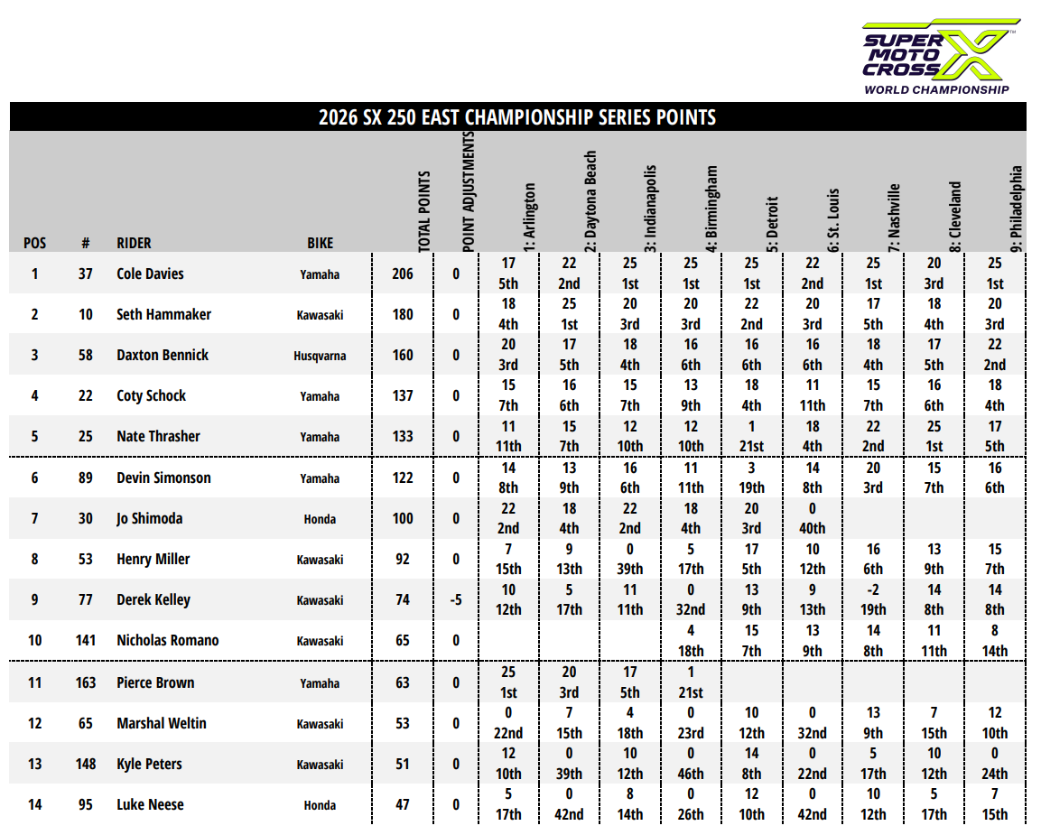 Cole Davies signe son cinquième succès de l’année à Philadelphie et soulève la couronne qui lui était promise au terme de sa deuxième saison, quittant le neuvième round avec 26 points d’avance sur Seth Hammaker. Daxton Bennick pointe troisième et compte de son côté 20 unités de retard sur le pilote Pro Circuit. La quatrième place finale se jouera entre Coty Schock et Nate Thrasher à Salt Lake City, deux pilotes séparés par 4 points.