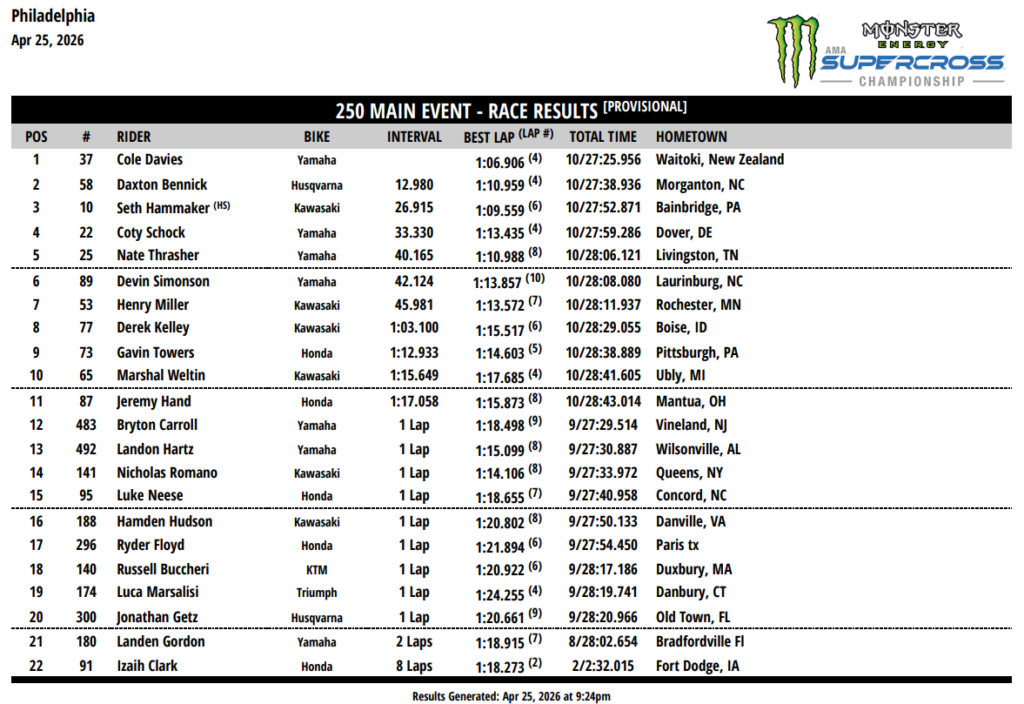 Premier Néo-Zélandais titré en championnat AMA depuis 2007 (19 ans plus tôt), mais aussi plus jeune pilote à décrocher une couronne depuis Trey Canard (18 ans plus tôt), Cole Davies s’impose à Philadelphie et décroche le titre de champion de Supercross 250 sur la côte Est cette saison. Il devient le cinquième Néo-Zélandais à inscrire son nom au palmarès international, après Shayne King, Ben Townley, Katherine Prumm et Courtney Duncan.