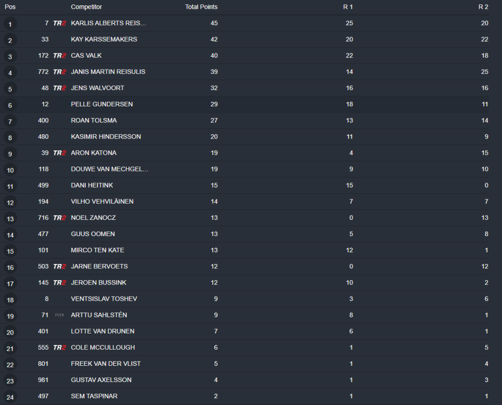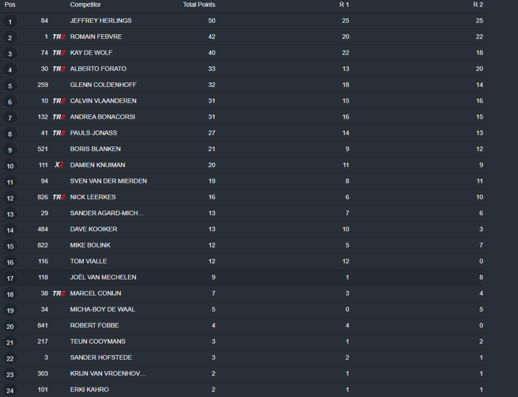 En catégorie 250, la victoire d’épreuve revient à Karlis Reisulis (1-3) devant Kay Karssemakers (3-2) et Cas Valk (2-4). Suivent Janis Reisulis (7-1), victime d’une chute en première manche, et Jens Walvoort (5-5) dans le top 5. Mention spéciale à Lotte van Drunen (15-23), qui roulait de nouveau face aux garçons du MX2 ce week-end et termine 20e sur 42 participants. On la retrouvera à Riola Sardo le week-end prochain.