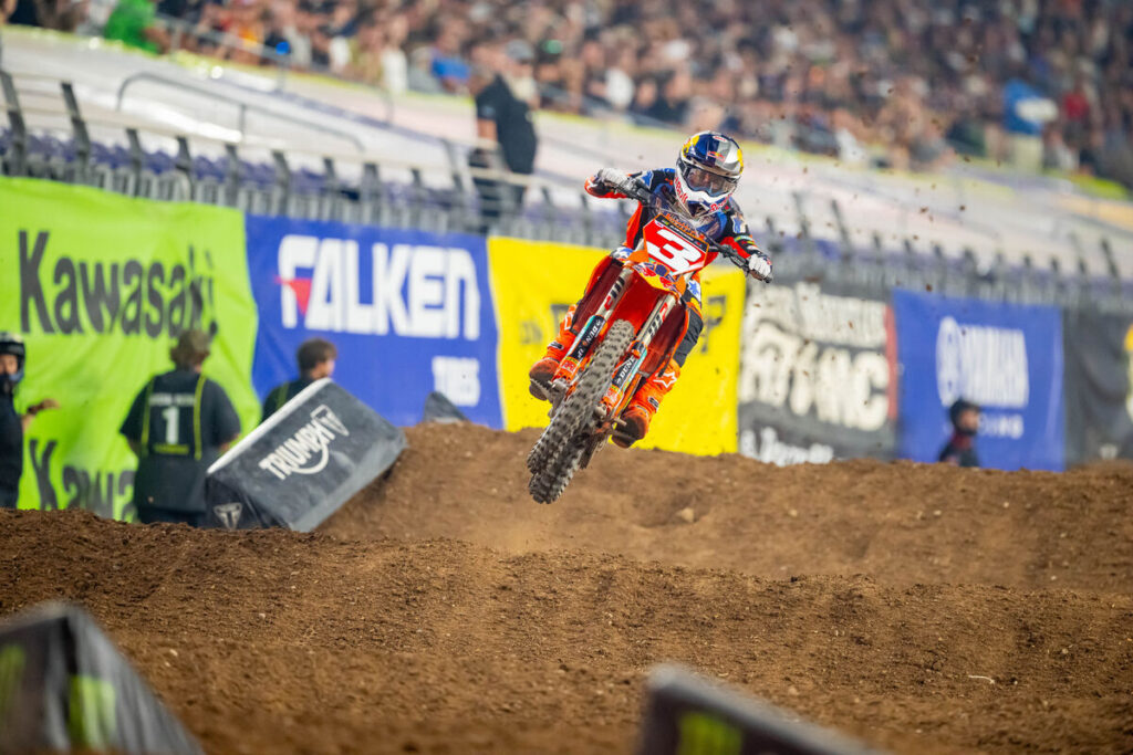 La saison d’Eli Tomac avait pourtant (très) bien commencé. Le nouvel officiel KTM s’imposait à Anaheim 1 puis à San Diego, avant de décrocher une troisième place à Anaheim 2. La quatrième place à Houston – après une chute – a marqué le début d’une dynamique moins favorable, qui débouchera sur une 12ᵉ position à Glendale.