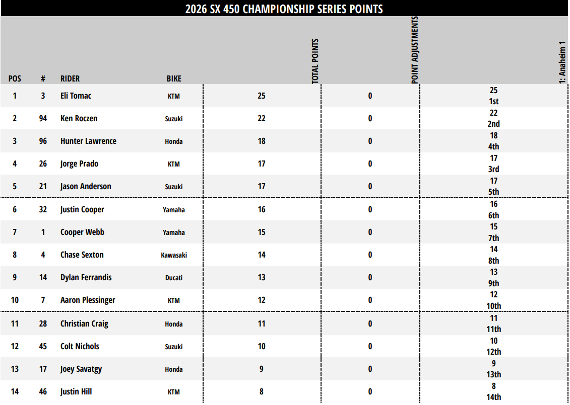 En s’imposant ce samedi à Anaheim 1 pour l’ouverture du championnat US de Supercross, Eli Tomac signe une victoire historique en triomphant pour le compte d’un quatrième constructeur. En misant sur ET#3, KTM avait vu juste. La 450 SX-F officielle quitte ce premier rendez-vous avec la plaque rouge, et Eli avec une 54ème victoire en poche après une course remportée devant un solide Ken Roczen et un Jorge Prado en pleine renaissance.