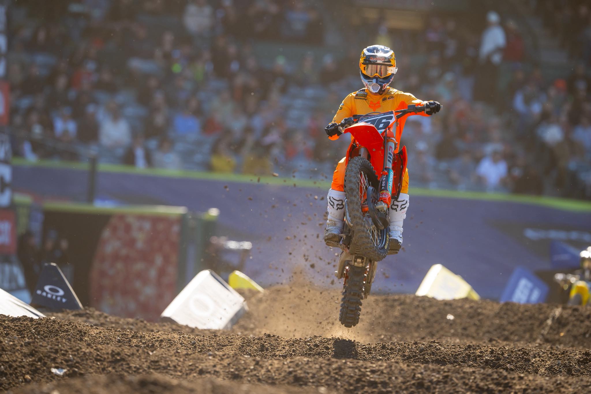 La première finale 450 de la saison a été marquée par la sortie du drapeau rouge dès le premier tour de la finale 450, suite à un accrochage entre Malcolm Stewart et Justin Barcia sur le premier triple. Contraint d’enrouler en double, Malcolm Stewart se fera atterrir dessus par Justin Barcia, violemment projeté au sol. Les deux pilotes en resteront là et seront pris en charge par les équipes médicales.