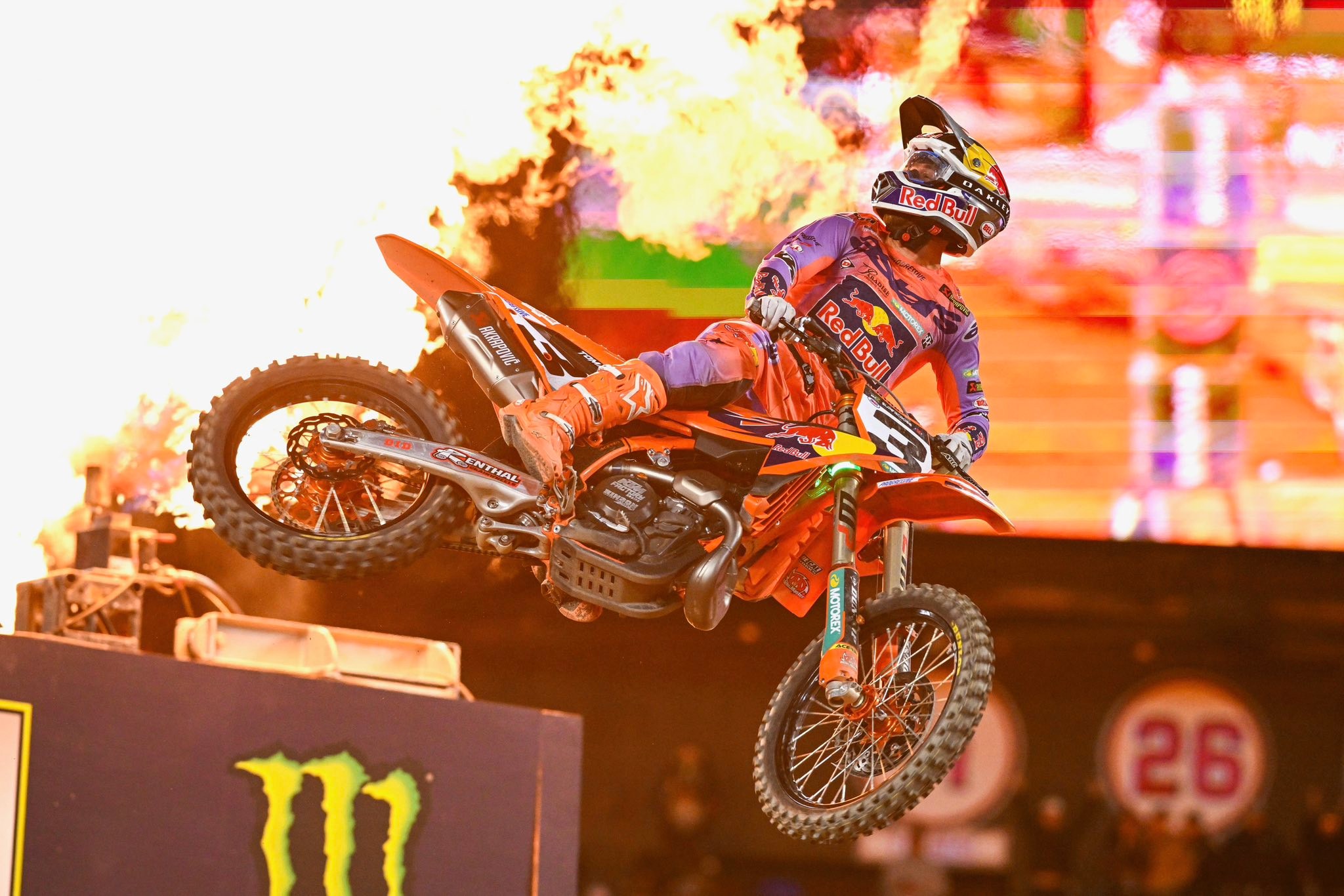 La première finale 450 de la saison a été marquée par la sortie du drapeau rouge dès le premier tour de la finale 450, suite à un accrochage entre Malcolm Stewart et Justin Barcia sur le premier triple. Contraint d’enrouler en double, Malcolm Stewart se fera atterrir dessus par Justin Barcia, violemment projeté au sol. Les deux pilotes en resteront là et seront pris en charge par les équipes médicales.