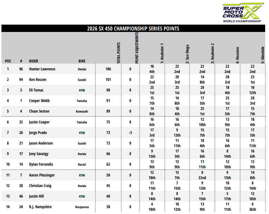 Cinq épreuves, quatre vainqueurs et un changement de leader au championnat SX US 450 après Glendale. Une fois de plus, Ken Roczen fait triompher la Suzuki chez les gros bras. Vainqueur à Glendale, le pilote Allemand prend possession de la seconde place provisoire du championnat derrière le nouveau leader Hunter Lawrence. Au tapis, Eli Tomac a perdu de gros points, mais reste dans la course au titre. Chaud devant.