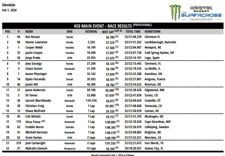 Joey Savatgy, toujours diminué par un orteil fracturé à Houston, signera une solide sixième place derrière l’Espagnol. Il devancera un Chase Sexton méconnaissable à Glendale : mauvaise qualification, mauvaise heat et finale compliquée. L’officiel Kawasaki termine septième devant Aaron Plessinger et Dylan Ferrandis, qui continue d’enchaîner les top 10 au guidon de la Ducati.