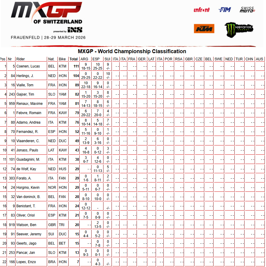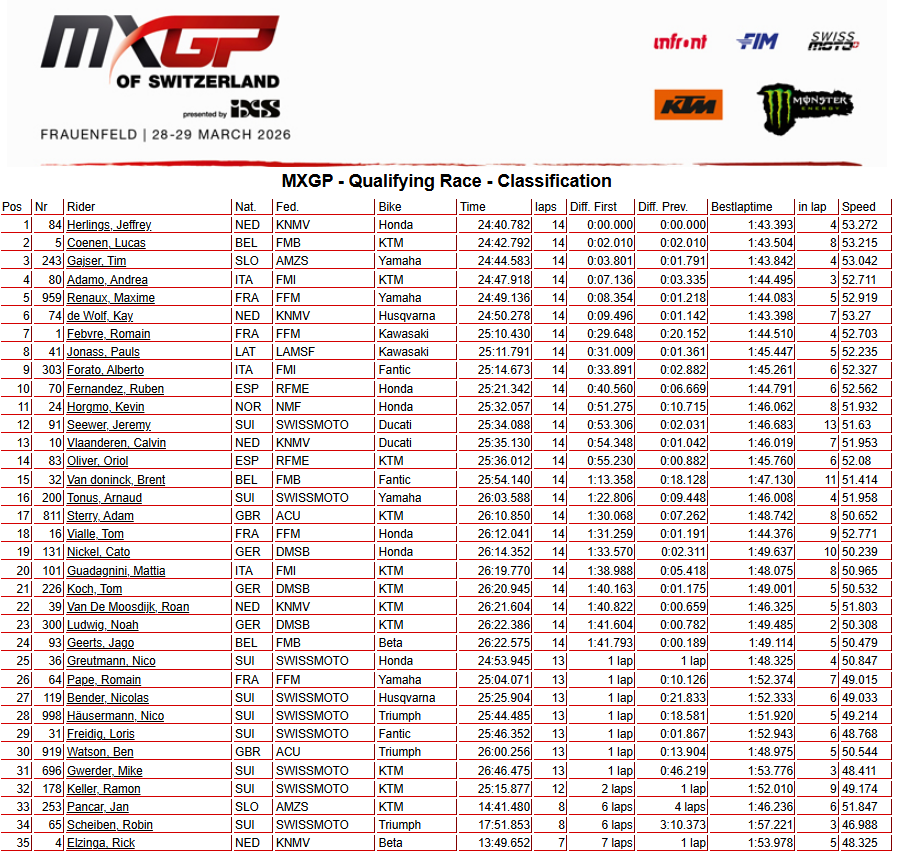 Notons que, parti dans le groupe de tête, Jeremy Seewer termine 12ᵉ ce samedi à domicile. Ce sera une 26ᵉ place pour Romain Pape, mais un abandon pour Jan Pancar et Rick Elzinga qui faisait ce samedi sa première sortie en MXGP sur la Beta du team Marchetti, qui doit se contenter de la 24ème place de Jago Geerts.