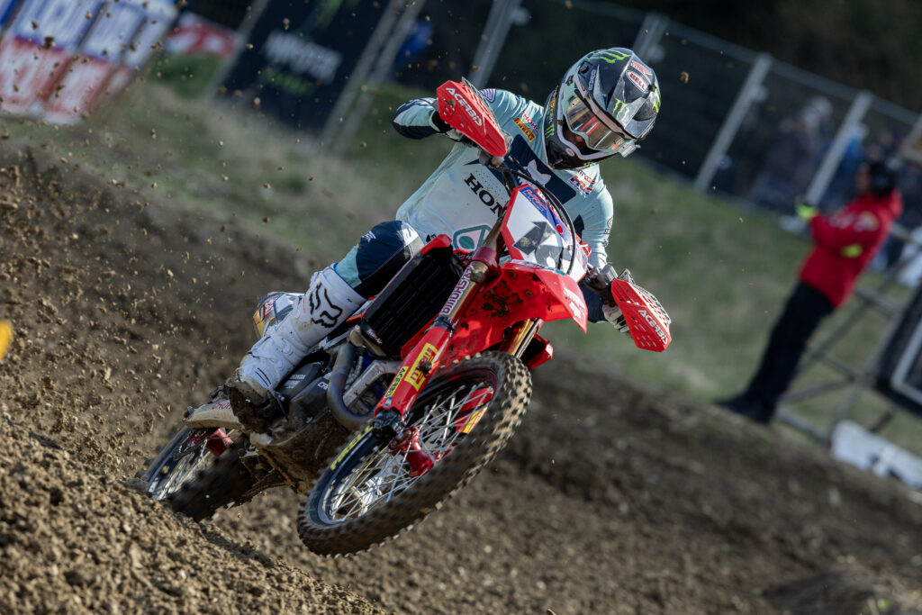 Jeffrey Herlings avait manqué de réussite lors des deux premières manches qualificatives de la saison, loupant les points à Bariloche puis à Almonte. L’officiel Honda HRC redresse la barre en Suisse ce samedi, en remportant le premier débat sous la pluie — et le froid — de Frauenfeld, devant Lucas Coenen et Tim Gajser.
