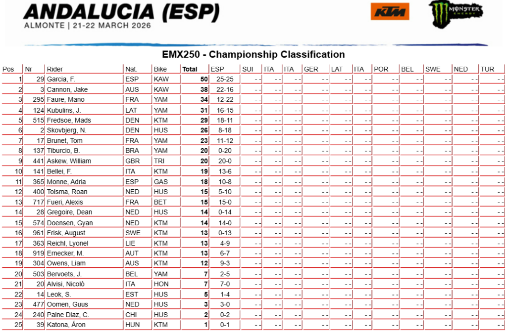 Situation au championnat EMX250