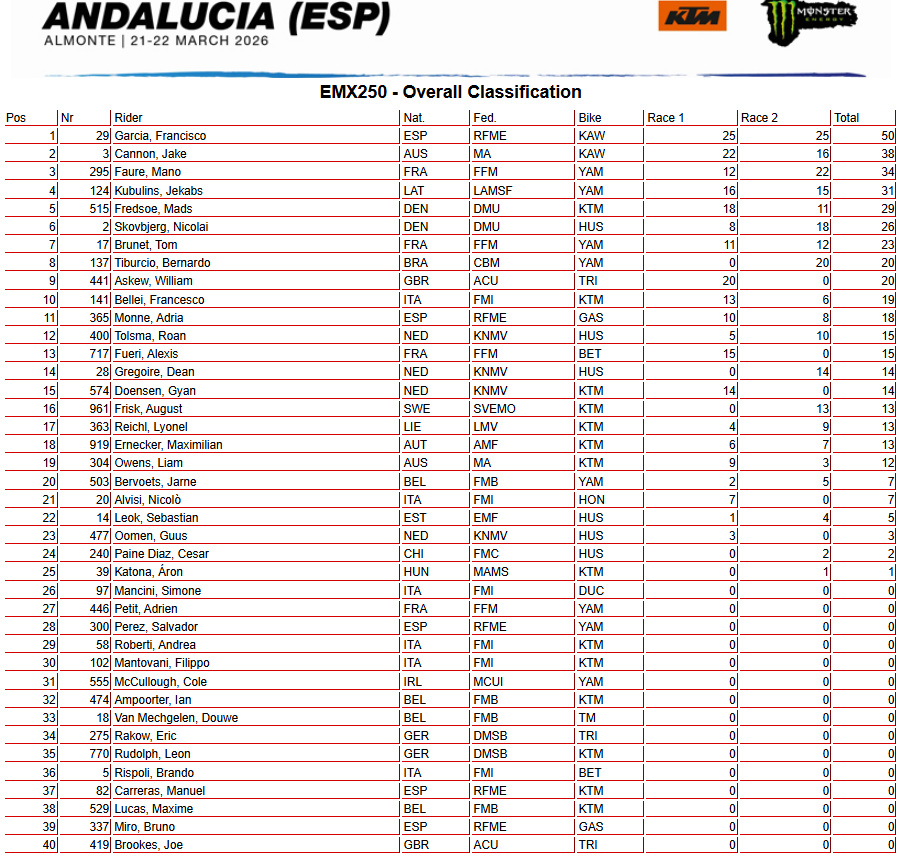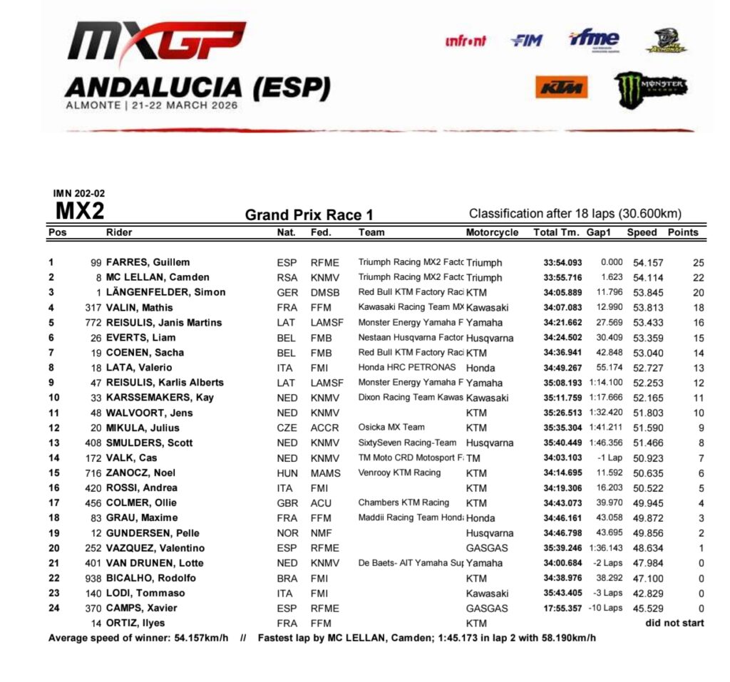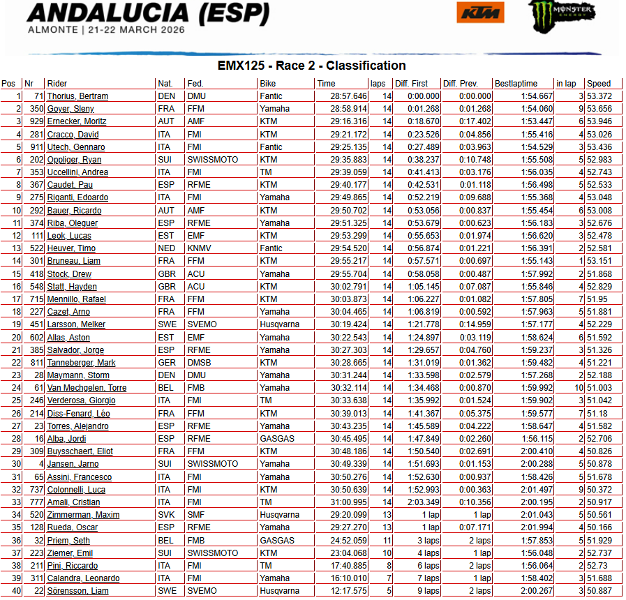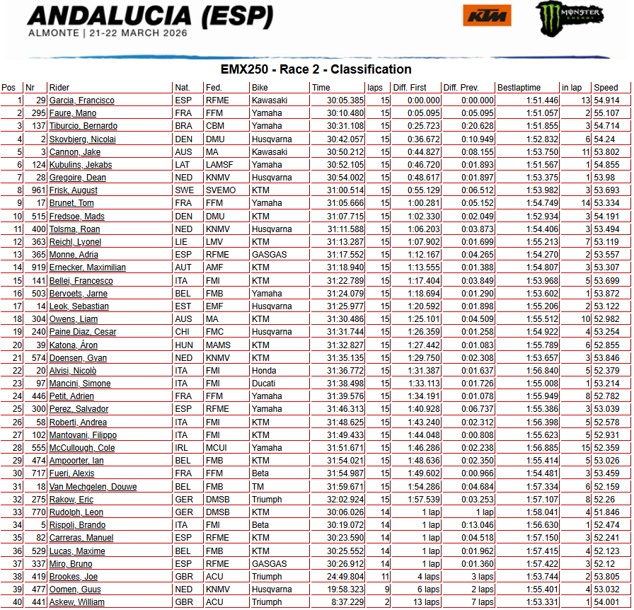 Direction l’Andalousie – et plus précisémment le nouveau tracé d’Almonte – pour la seconde épreuve du championnat du monde MXGP, qui accueille aussi l’ouverture des championnats d’Europe 125 et 250. Les résultats de la journée du dimanche sont à retrouver ci-dessous.