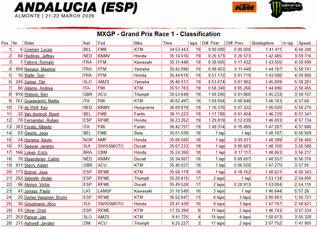 Direction l’Andalousie – et plus précisémment le nouveau tracé d’Almonte – pour la seconde épreuve du championnat du monde MXGP, qui accueille aussi l’ouverture des championnats d’Europe 125 et 250. Les résultats de la journée du dimanche sont à retrouver ci-dessous.