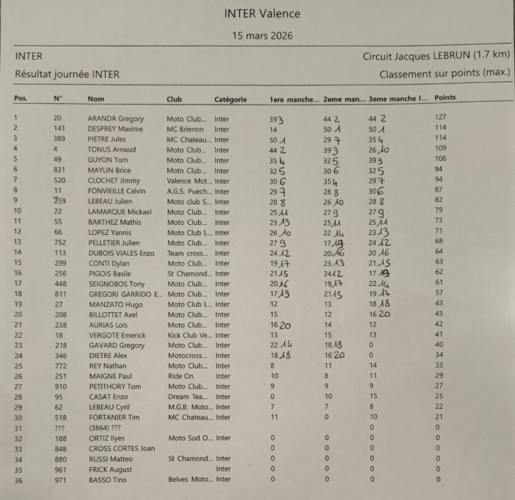 Avec cinq catégories en piste et plus de 150 pilotes engagés, pas moins de quinze départs ont été donnés sur le tracé de Valence. Un programme dense qui a finalement vu Grégory Aranda tirer son épingle du jeu dans la catégorie Inter, au terme d’une journée marquée par la régularité. Sous les couleurs du team 595 Racing, il s’impose devant Maxime Desprey et Jules Piètre au terme des trois manches.