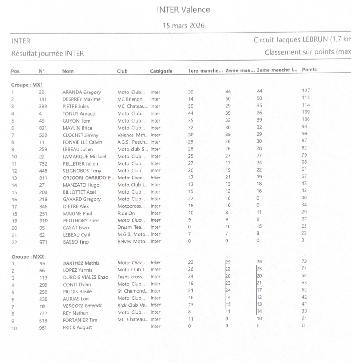 Avec cinq catégories en piste et plus de 150 pilotes engagés, pas moins de quinze départs ont été donnés sur le tracé de Valence. Un programme dense qui a finalement vu Grégory Aranda tirer son épingle du jeu dans la catégorie Inter, au terme d’une journée marquée par la régularité. Sous les couleurs du team 595 Racing, il s’impose devant Maxime Desprey et Jules Piètre au terme des trois manches.