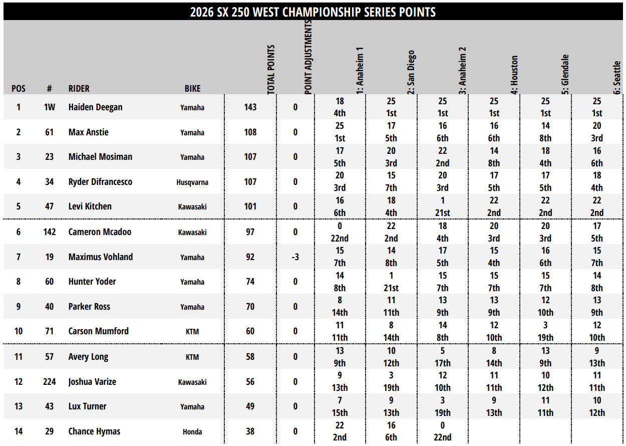 Haiden Deegan aborde la pause avec 35 points d’avance sur Max Anstie, et 36 d’avance sur Michael Mosiman. Une avance plus que ‘confortable’. Aux portes du top 3 figurent Ryder DiFrancesco (-36) et Levi Kitchen (-42). Alors que les pilotes de la côte Est rentreront en piste la semaine prochaine à Arlington, la côte Ouest observe une pause de 5 semaines et reviendra en piste le 22 mars pour la première confrontation Est / Ouest de Birmingham.