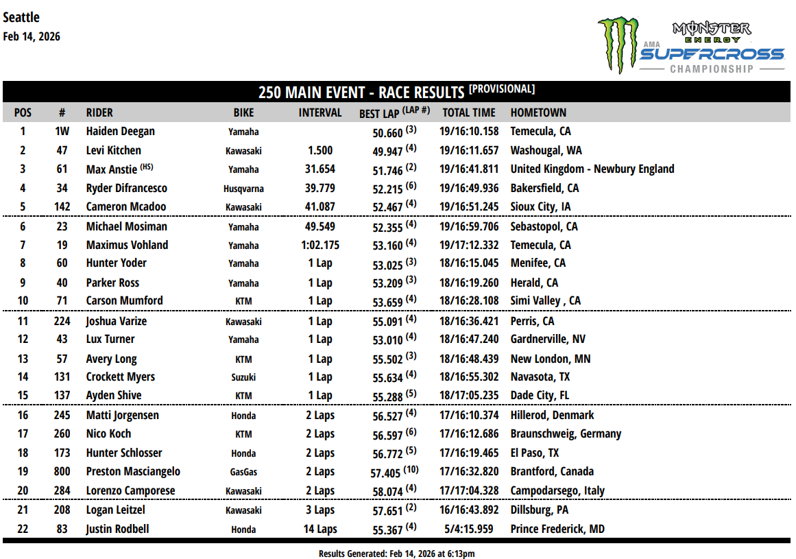 Haiden s’impose à Seattle – sa cinquième victoire consécutive cette saison, une performance qui n’avait plus été réalisée depuis Ryan Villopoto en 2007 ! Levi Kitchen termine deuxième devant son public, après avoir signé le meilleur tour en course, tandis que Max Anstie complète le podium, à plus de 30 secondes du duo de tête. En bataille avec Cameron McAdoo durant toute la finale, Ryder DiFrancesco résistera au pilote Kawasaki pour s’adjuger la quatrième place à Seattle.