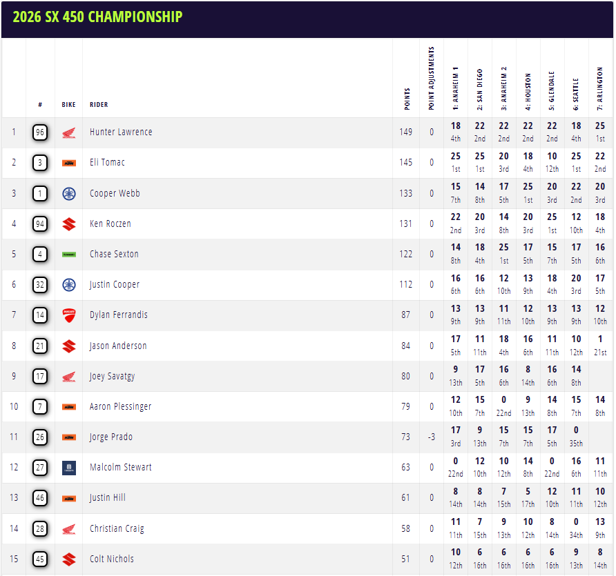 Au championnat, Hunter Lawrence compte désormais 4 points d’avance sur Eli Tomac, 16 d’avance sur Cooper Webb, et 18 d’avance sur Ken Roczen. Chase Sexton compte officiellement une épreuve de retard à ce stade de la saison, pointant à 27 points de la plaque rouge – en 5ème position – avant Daytona.