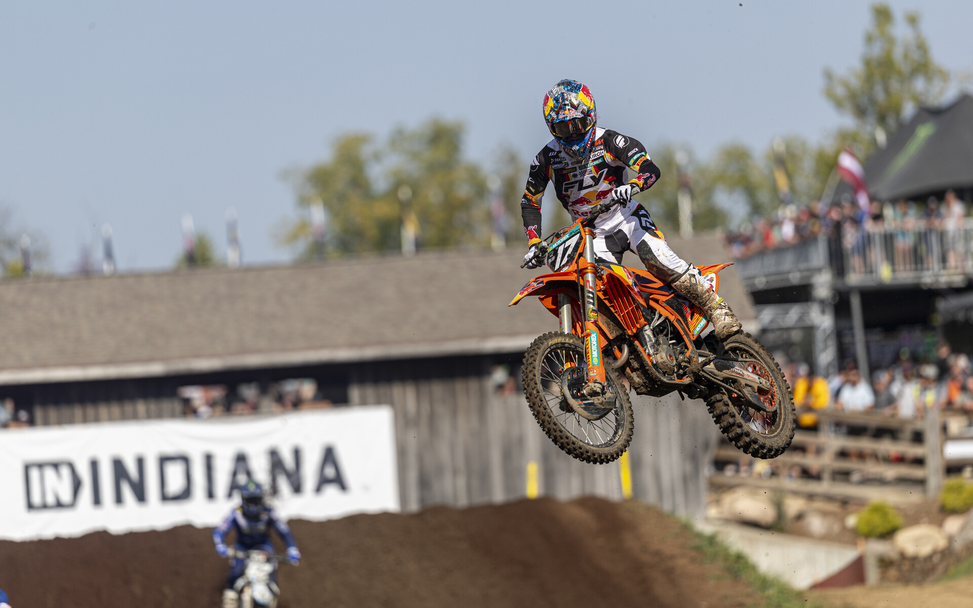 Mais tout s’est effondré dès les premiers mètres de la manche MX2 + MXGP. Parti devant, Ken Roczen glissera dans le troisième virage et repartira bon dernier. Simon Langenfelder, lui, n’aura pas cette chance : victime d’une chute dans les premiers virages, le champion du monde MX2 en titre sera percuté par plusieurs concurrents. Verdict : côtes et omoplate fracturées. Il ne repartira pas, et le pilote De Carli KTM connaîtra une fin de saison brutale aux USA, ou il avait à cœur d’étrenner son titre mondial.