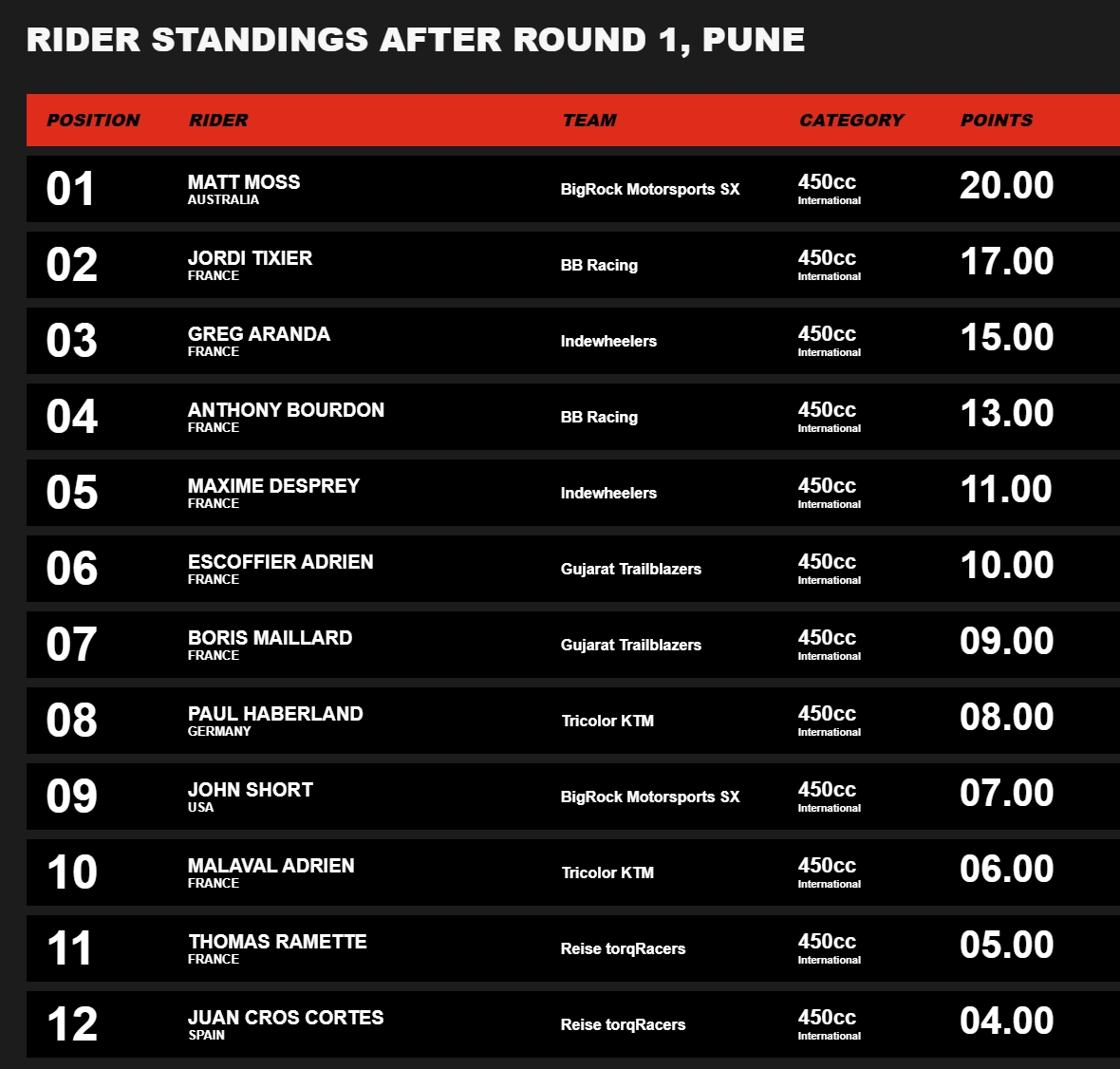 Malgré ce conflit de calendrier avec le World Supercross, Matt Moss et Anthony Bourdon seront bien présents en Inde. Le premier a remporté le round d’ouverture à Pune en SX1 devant Jordi Tixier, Grégory Aranda et — justement — Anthony Bourdon. Tous deux engagés sur le WSX (l’Australien avec Bud Racing Kawasaki et le Français avec Quad Lock Honda), Matt comme Anthony participeront à la seconde épreuve de l’ISRL ce week-end. Leurs remplaçants respectifs pour le World Supercross de Stockholm se nomment Luke Clout (Bud Racing) et Alex Larwood (Quad Lock Honda).