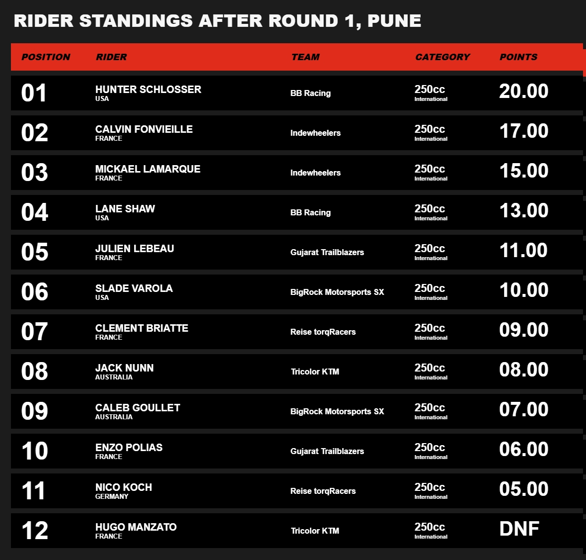 Suite à sa victoire à Pune, l’Américain Hunter Schlosser mène le championnat SX2 devant le champion de France SX2 en titre, Calvin Fonvieille, ainsi que Mickaël Lamarque.