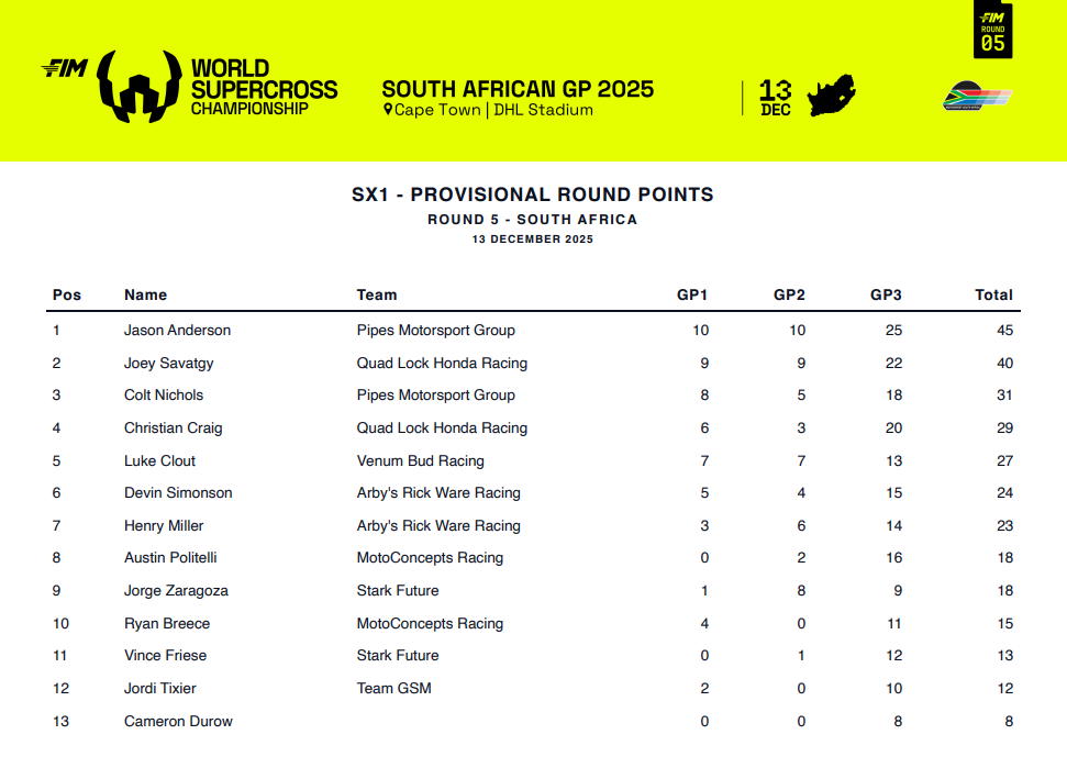 Vainqueur en Suède, Jason Anderson ramène le triplé — et le titre — en Afrique du Sud. Il devance Joey Savatgy (2-2-2) de cinq points lors de l’épreuve, mais aussi au championnat. Sur le podium de cet ultime round, on retrouvera Colt Nichols (3-6-4), qui devancera Christian Craig (5-8-3), bien malchanceux en début de soirée. L’Australien Luke Clout (4-4-8) fera les affaires du team Bud Racing Kawasaki en arrachant la 5e place de cet ultime round, après la blessure de Matt Moss et le départ anticipé de Justin Hill.