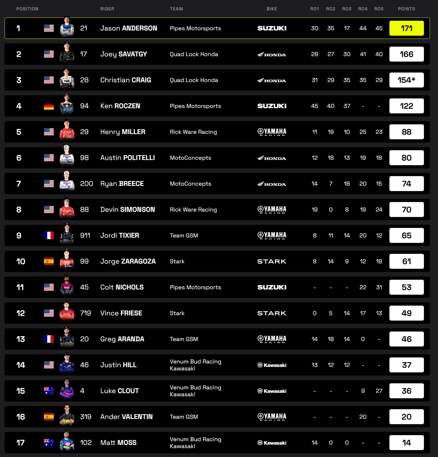 Suivront les coéquipiers du team RWR, Devin Simonson (6-7-6) et Henry Miller (8-5-7), aux portes du top 5. Seul Français en piste après le forfait d’Aranda, Jordi Tixier termine 12e devant l’unique wildcard, Cameron Durow. Le team GSM avait fait appel à Ander Valentin pour remplacer Aranda lors de la finale, mais le pilote espagnol s’est blessé d’entrée de jeu et n’a pu participer à l’épreuve. Notons qu’une semaine plus tôt — en Suède — Ander avait fait l’intendance chez Bud Racing Kawasaki dans la catégorie !