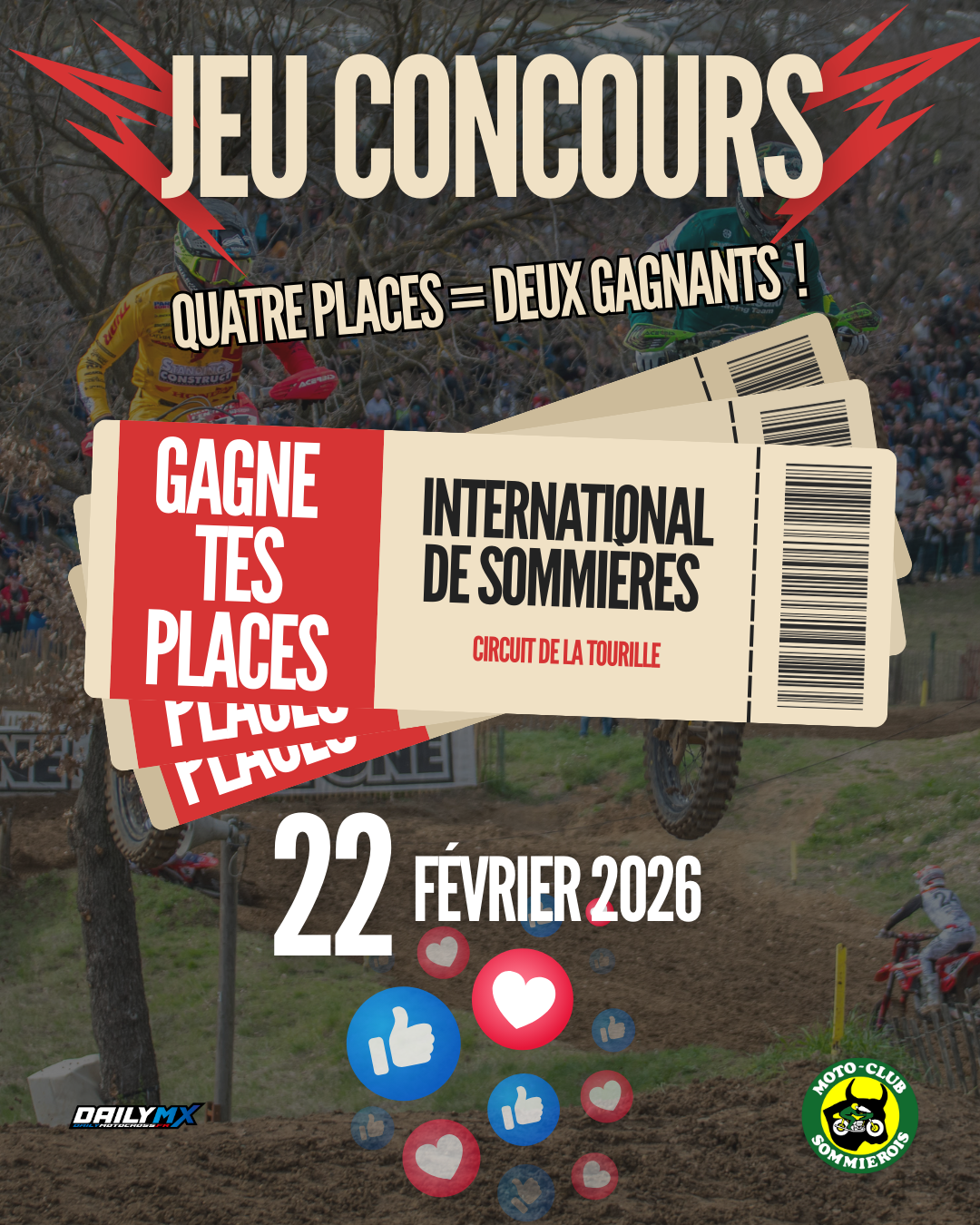 À l’occasion de la 59ᵉ édition de l’International du même nom, le Motoclub Sommièrois et DailyMotocross te font gagner quatre places, soit deux lots de deux places, pour vibrer avec nous lors de l’événement.