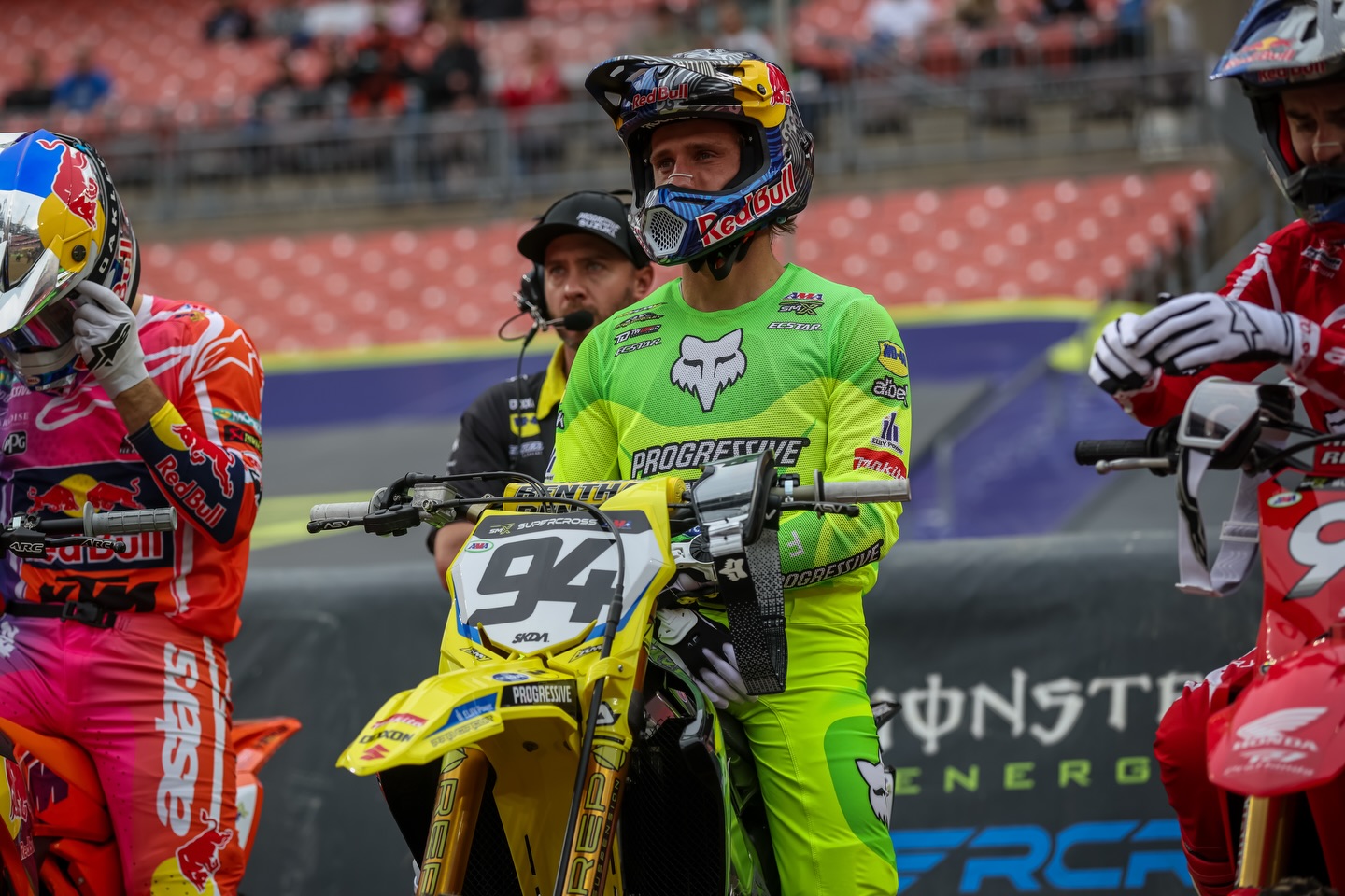 « Le tracé était plus difficile pour la finale que durant la manche qualificative », explique le pilote HEP Suzuki au sujet de sa finale. « Je savais qu’il fallait que je parte devant pour avoir le champ libre. Avec Cooper et Hunter juste devant moi au départ, ce n’était pas la tâche la plus simple, mais j’ai réussi à les doubler. De là, j’ai juste fait ma course. À un moment, Hunter a plongé à l’intérieur. C’est compliqué parce que dans ces conditions, on utilise des roll-offs et le champ de vision est vraiment limité en comparaison avec des tear-offs, donc tu ne vois pas très bien dans ce genre de moment crucial. Après quoi, j’ai essayé de rester sur mes roues, d’attaquer tout en restant sur la retenue. Finalement, en fin de course, c’était hyper serré. On a fait le yo-yo, parce qu’on pouvait avoir un coup de chance avec les retardataires, et un coup non. À quelques reprises, j’ai carrément enroulé tout un enchaînement car les mecs devant moi en enroulaient aussi. Tout s’est resserré à partir de là. »