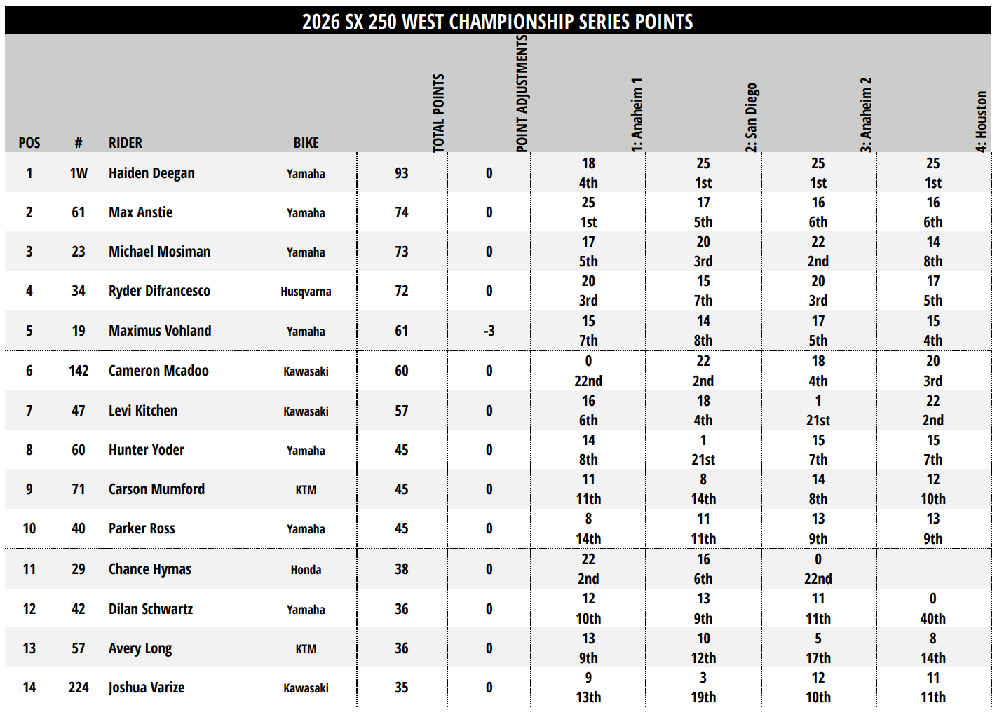 Haiden Deegan abordera la cinquième épreuve de la saison avec 19 points d’avance sur Max Anstie. Vainqueur à Anaheim 1, le pilote britannique a enchaîné avec un 5-6-6 depuis, mais parvient à reprendre la seconde place du provisoire à son coéquipier Michael Mosiman (-20) suite à son contre-résultat de Houston. Trois pilotes se tiennent en deux unités pour la seconde place provisoire du championnat, puisque Ryder DiFrancesco (-21) est à l’affût en quatrième position. Cinquième, Maximus Vohland (-32) devance Cameron McAdoo (-33) d’un point. Levi Kitchen n’est que septième du championnat alors que la mi-saison approche ; il accuse un déficit de 36 points sur Deegan.