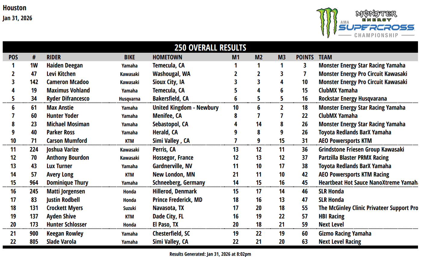 Trois finales, trois victoires pour Haiden Deegan à Houston ce samedi. L’officiel Star Racing Yamaha signe sa troisième victoire de la saison — consécutive — en raflant le premier round Triple Crown de la saison 2026. Les points défilent et, après quatre épreuves, le champion en titre compte 19 unités d’avance sur son premier poursuivant. Deegan, Anstie et Mosiman sont présents dans le top 3 provisoire du championnat avant Glendale. L’armada Star Racing, encore !
