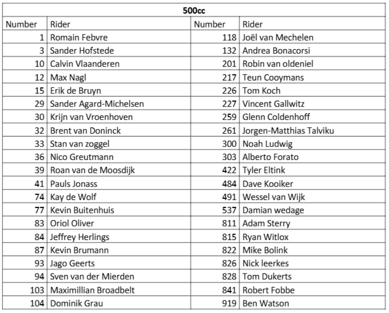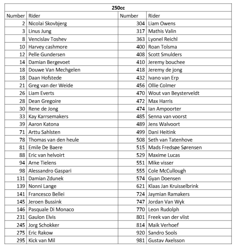 Jeffrey Herlings fera sa deuxième sortie de la saison à Lierop, après avoir roulé lors de la finale de l’International de Mantova en Italie. Il sera rejoint par Romain Febvre, qui effectuera lui aussi sa deuxième sortie de l’année après Pernes-les-Fontaines. Il sera en piste avec son coéquipier Pauls Jonass, présent à Sommières dimanche dernier. Les officiels Ducati Calvin Vlaanderen et Andrea Bonacorsi seront également de la partie, mais sans Jeremy Seewer. Fantic alignera Brent Van Doninck et Alberto Forato avant de prendre la direction de l’Argentine. On note aussi la présence de Jago Geerts, Ben Watson (engagé sur le championnat britannique et quelques GP européens cette année), ainsi que Glenn Coldenhoff, qui se prépare pour sa première saison au Brésil. Roan Van de Moosdijk, Oriol Oliver, Max Nagl et Adam Sterry seront également présents, comme le duo Suisse Brumann / Greutmann et quelques spécialistes du sables Hollandais.