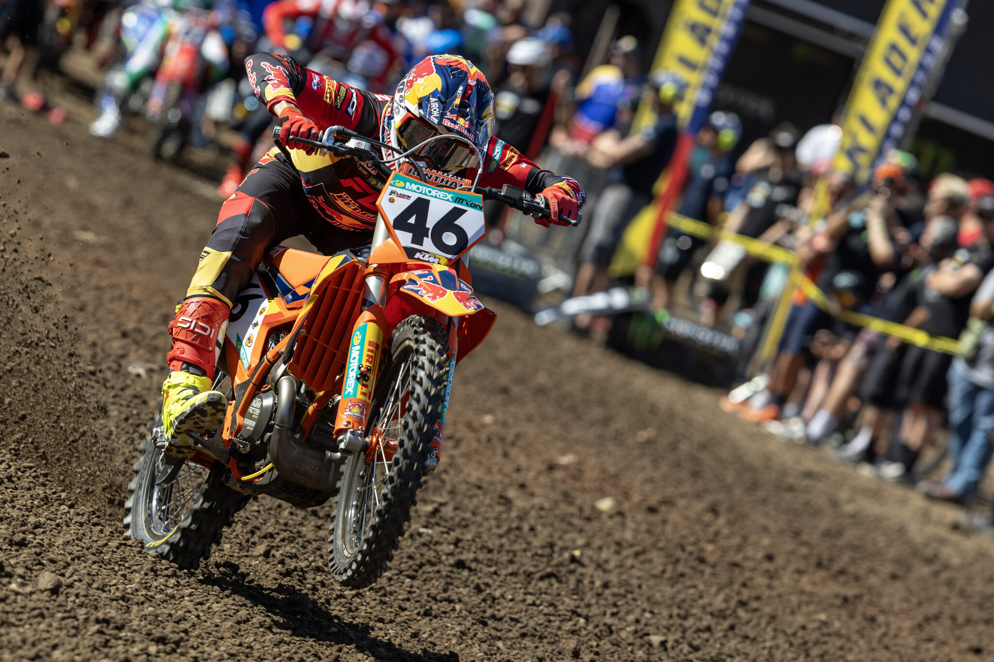 « En seconde manche, j’étais derrière Hunter. Je l’observais. J’attendais« , explique l’officiel KTM à propos de sa seconde manche au contact de l’aîné des Lawrence. « Je ne sais pas exactement ce qu’il s’est passé pour que je chute à cet endroit… Je n’ai rien fait de particulier. Ce n’est pas comme si j’avais tenté d’envoyer le double comme Jett pouvait le faire. J’ai enroulé les bosses, puis j’ai perdu l’avant et je suis passé par-dessus le guidon. C’est vraiment dommage. Je sais qu’il y a encore beaucoup de progrès à faire, et il faut que je trouve de la confiance sur la moto pour me sentir mieux. Il y aura des jours meilleurs. »