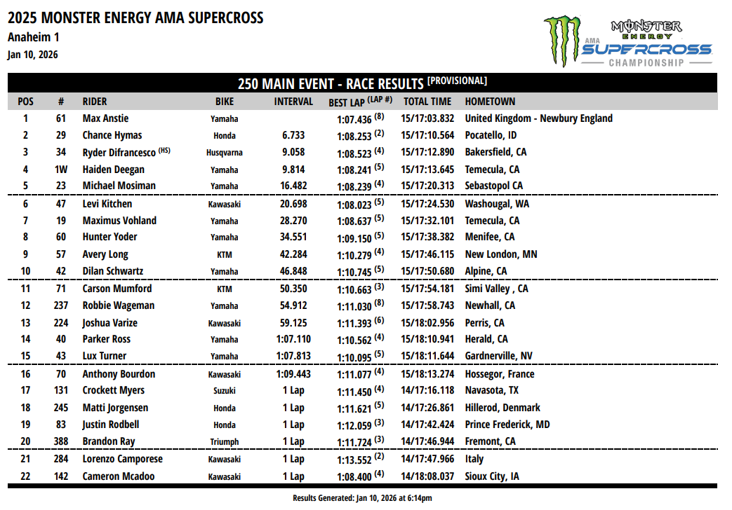 Vétéran de la catégorie 250 sur la côte Ouest, Max Anstie démarre du bon pied. Tout juste couronné d’un second titre mondial en SX2, l’officiel Star Racing Yamaha a bétonné pour l’ouverture de la saison. Vainqueur de sa heat et parti quatrième en finale, il ira chercher Cameron McAdoo, puis Chance Hymas et enfin Ryder DiFrancesco sans rencontrer de résistance, pour s’imposer au terme des 15 tours de cette première finale de la saison. Parti second, puis doublé par Anstie, Chance Hymas ira également déborder Ryder DiFrancesco pour s’adjuger la deuxième place, devant le jeune officiel Husqvarna qui décroche son tout premier podium de carrière à Anaheim 1.