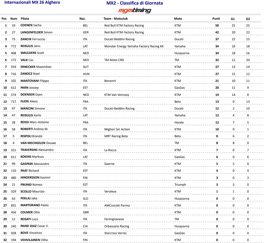 Deuxième de la journée, on retrouve le champion du monde MX2 en titre Simon Langenfelder (3-2), qui — en proie à un gros mal aux bras — n’a pas tenté le diable dans les conditions difficiles d’Alghero. Ferruccio Zanchi (2-6) complète le podium de la catégorie MX2 pour sa première sortie en compétition sur la 250 Ducati, non sans avoir été surpris par Scott Smulders dans les dernières minutes de course du second débat.