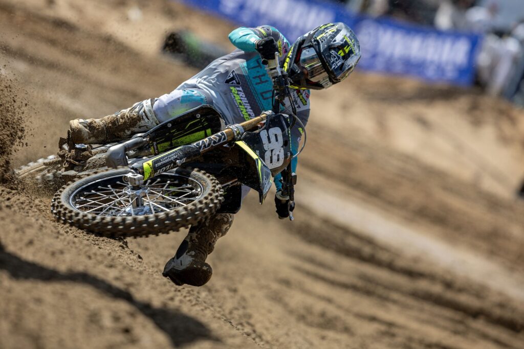Débarqué sur le mondial MX2 en 2024, Triumph décroche sa toute première victoire de Grand Prix en Espagne ce dimanche avec Camden McLellan et ce, dès l’entame de sa troisième saison sur le championnat. Le pilote sud-africain s’offre ainsi son premier succès, mais aussi sa première plaque rouge puisqu’il prend les commandes de la série à Almonte. Après le double podium Argentin, le constructeur Britannique confirme avec ses effectifs en remportant les deux manches en Espagne: la première avec Guillem Farres, et la seconde avec Camden McLellan.