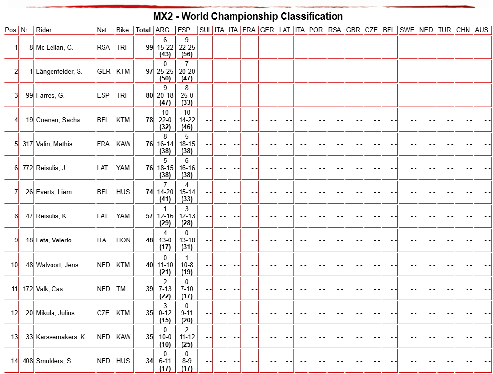 Camden McLellan prend les commandes du championnat pour deux points d’avance sur Simon Langenfelder, et 19 points d’avance sur son coéquipier Espagnol Guillem Farres. Sacha Coenen (-21) et Mathis Valin (-23) sont présents dans le top 5 avant le GP de Suisse.