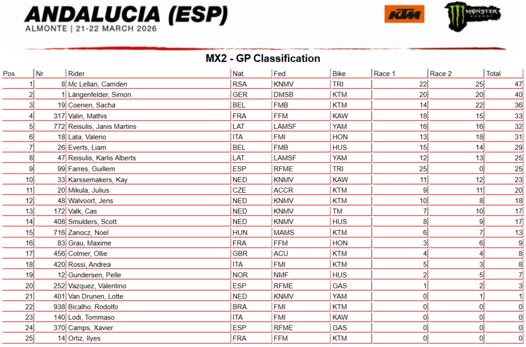 Camden McLellan (2-1) remporte le Grand Prix d’Espagne devant Simon Langenfelder (3-3) et Sacha Coenen (7-2). Mathis Valin (4-6) et Janis Reisulis (5-5) suivent dans le top 5. Valerio Lata (8-4), Liam Everts (6-7), Karlis Reisulis (9-8), Guillem Farres (1-DNF) et Kay Karssemakers (10-9) complètent le top 10 ce week-end. Maxime Grau (18-15) termine 16ème du Grand Prix d’Andalousie.