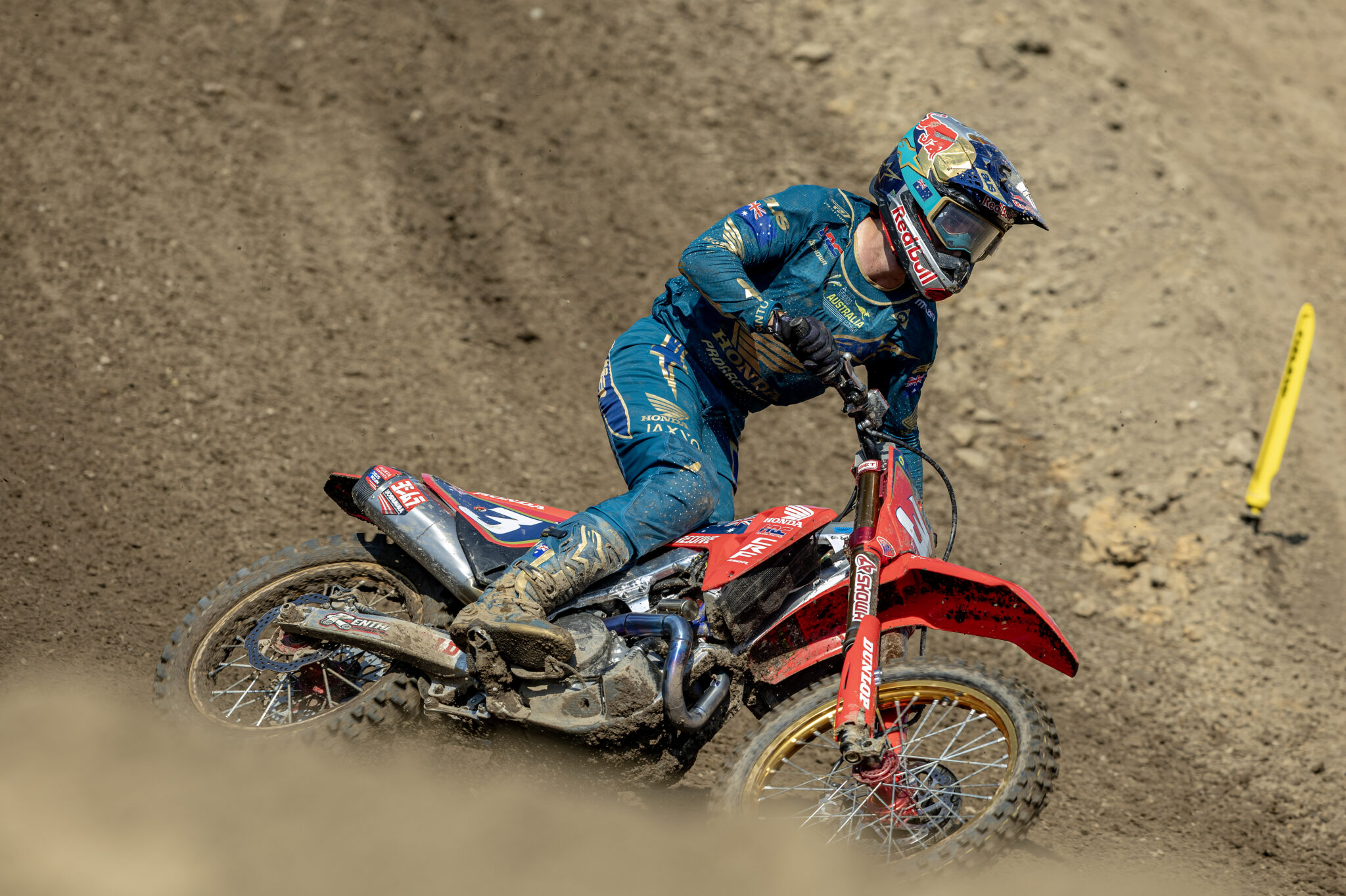 Alors que la seconde moitié de manche sera entamée, Hunter Lawrence perdra l’avant dans un virage. S’il mettra un genou à terre, le pilote australien conservera le leadership de la manche et une belle avance sur son premier poursuivant : Jo Shimoda. Hunter partira à la faute une nouvelle fois en toute fin de manche, mais – là encore – ne sera pas repris et s’imposera devant le Japonais.