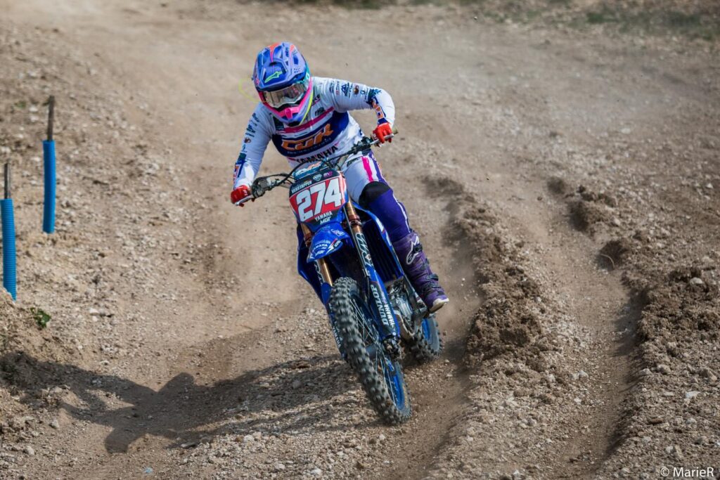 Rien n’était gagné d’avance pour April Franzoni, qui chutait lourdement en matinée sur le tracé béton de La Combe Bésine. Mais la pilote soutenue par Honda SR Motoblouz a réalisé le holeshot lors de la première manche, enregistré le meilleur chrono et mené tous les tours devant Amandine Verstappen, la devançant de 30 secondes au passage sous le drapeau à damier. La troisième place semblait promise à Lena Marques, mais une erreur de la pensionnaire du Moto Club des Sables en toute fin de manche la relègue en cinquième position, dépassée par Lysa Raoux (3e) et Lisa Guerber (4e).