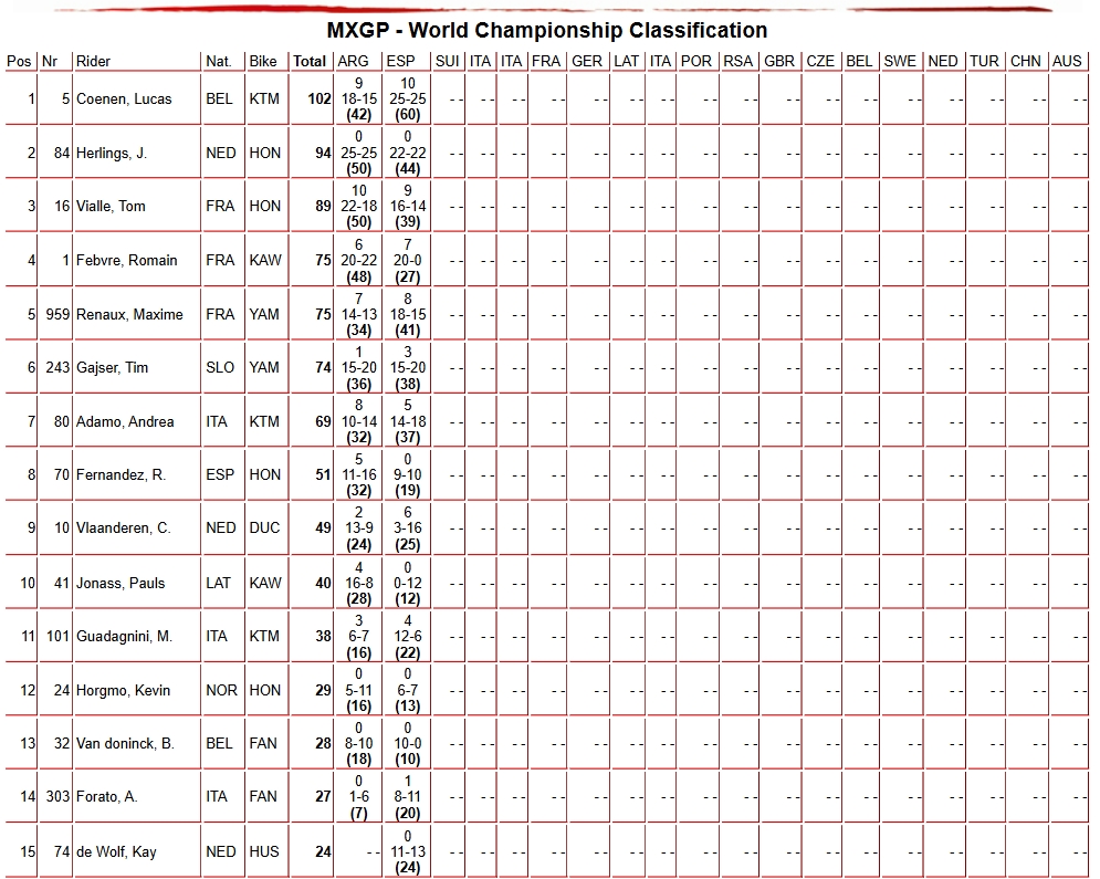 Lucas Coenen repart d’Espagne avec la plaque rouge de leader du championnat et 8 points d’avance sur Jeffrey Herlings. Tom Vialle (-13) pointe troisième après le GP d’Espagne, devant Romain Febvre (-27) et Maxime Renaux (-27).