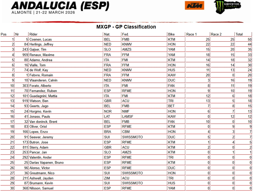 Lucas Coenen (1-1) remporte le GP d’Espagne devant Jeffrey Herlings (2-2) et Tim Gajser (6-3). Maxime Renaux (4-6) termine au pied du podium devant Andrea Adamo (7-4) et Tom Vialle (5-7). Kay de Wolf (10-8), Romain Febvre (3-DNF), Calvin Vlaanderen (18-5) et Alberto Forato (13-10) intègrent le top 10 en Andalousie.
